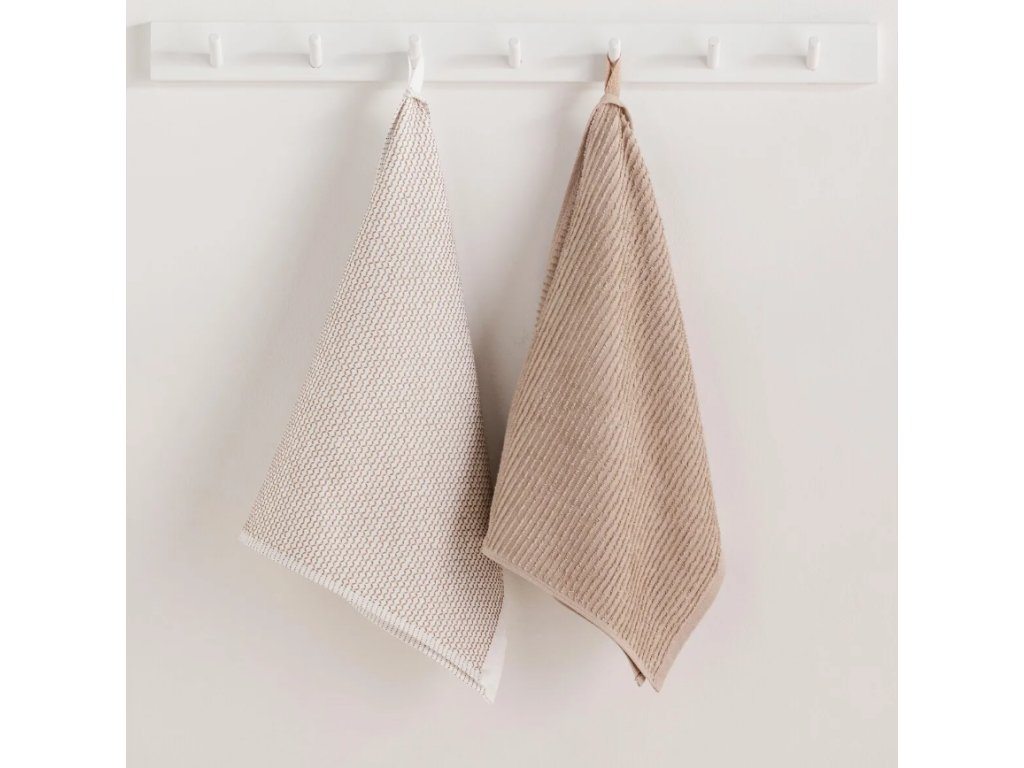 Táto elegantná súprava kuchynských uterákov so závesom je spojením štýlu a funkčnosti. Do súpravy patrí béžový uterák s jemným tmavým vzorom, ktorý dodáva produktu jemnosť a sofistikovanosť. Druhý uterák v jemnej svetlobéžovej farbe vnáša do kuchynského prostredia trochu sviežosti a prirodzenosti, čím podčiarkuje harmonický dizajn celej súpravy.