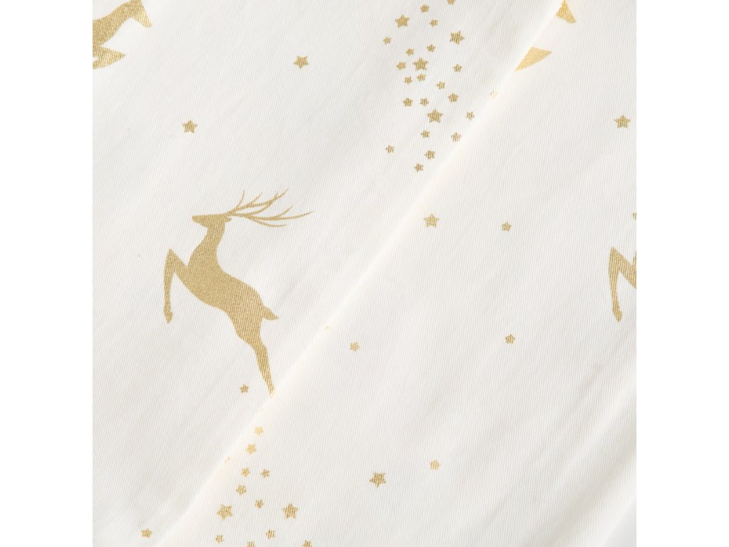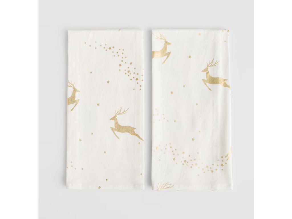 Biela farba so zlatou potlačou skákajúcich sobov a drobných hviezdičiek spôsobuje, že súprava utierok dirdis sa dokonale hodí do sviatočnej atmosféry, dodávajúc interiéru eleganciu a subtílny lesk. Precízne obšitie a hladký, matný povrch podčiarkujú vysokú kvalitu spracovania. Súprava skvele doplní tradičnú aj modernú kuchyňu a osvedčí sa ako štýlový darček, najmä na Vianoce.