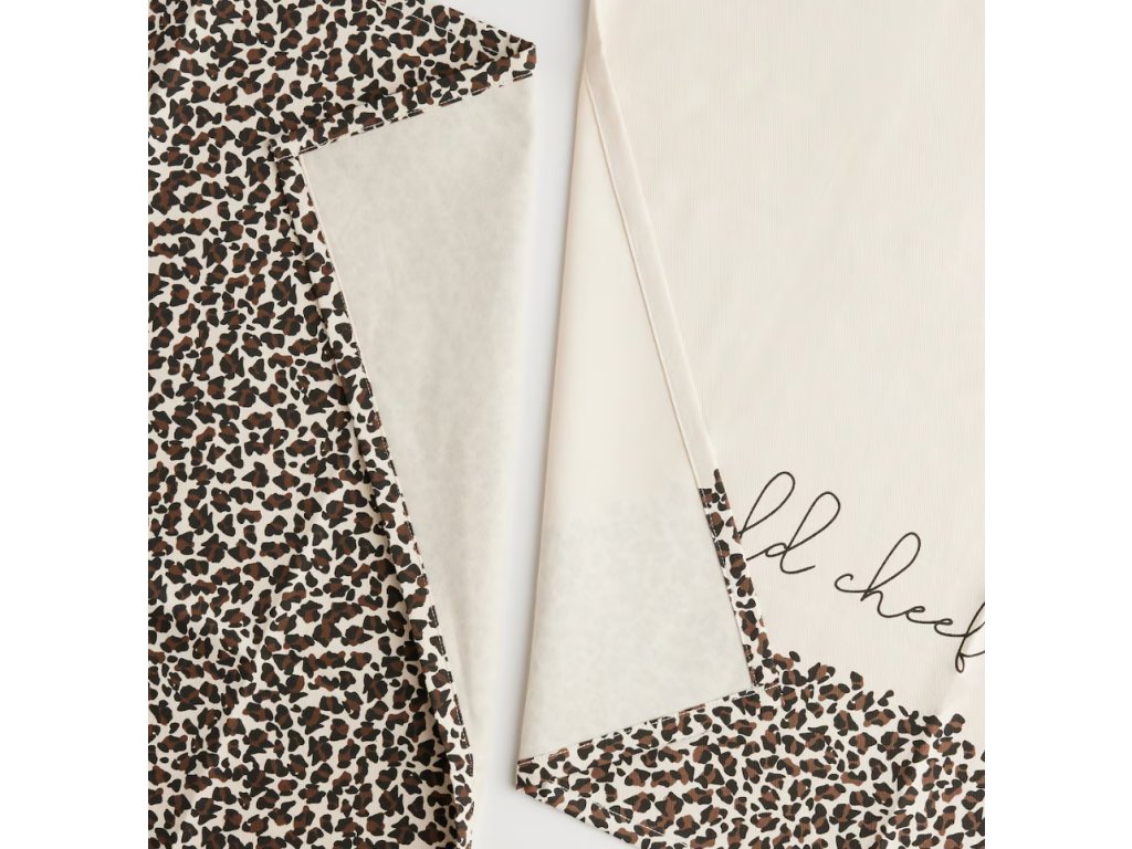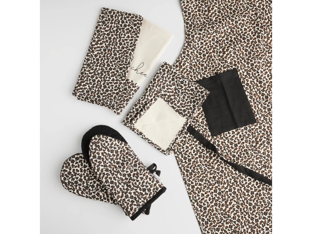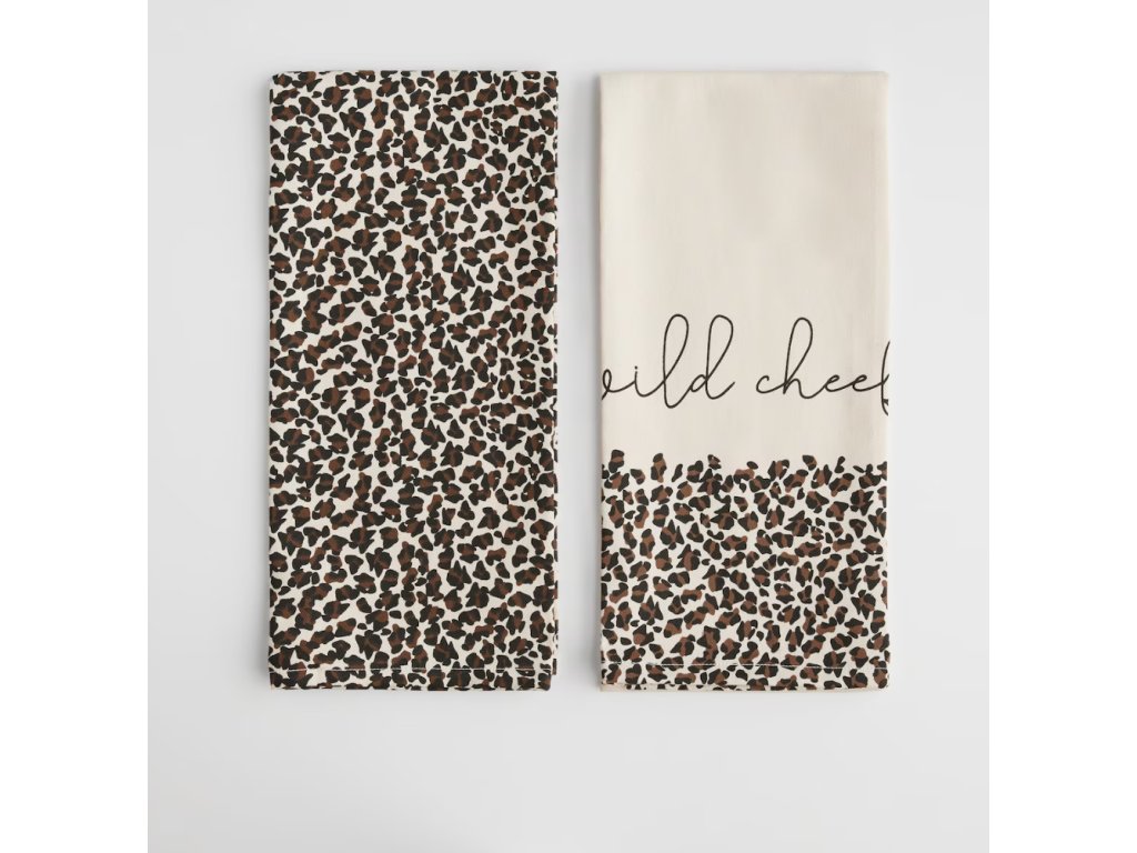 Súprava dvoch kuchynských utierok z bavlny v béžovej farbe, zdobených moderným leopardím vzorom. Každá utierka má rozmer 45 x 65 cm, vďaka čomu je praktická a pohodlná na každodenné používanie. Sú mäkké, savé a trvácne, ideálne na utieranie riadu, pracovných dosiek alebo rúk, pričom do kuchyne vnesú štýlový zvierací akcent.