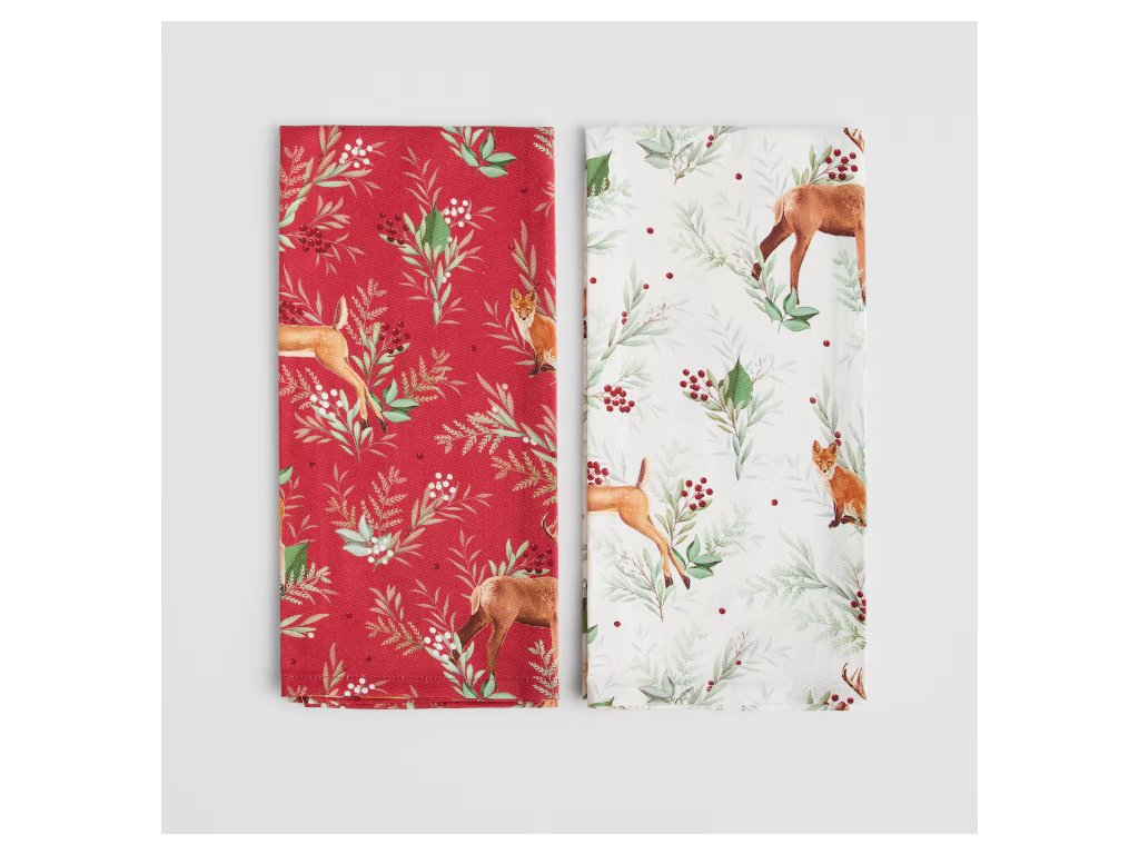 Súprava sa vyznačuje sviatočným dizajnom: jedna utierka v odtieni intenzívnej červenej, zdobená rastlinnými motívmi, bielymi a červenými bobuľami a líškami; druhá vo svetlobéžovej farbe, taktiež s motívom listov a realistických líšok. Oba vzory odkazujú na zimné a sviatočné aranžmány, krásne sa prezentujú na stole alebo zavesené na viditeľnom mieste. Ideálna voľba ako ozdoba kuchyne, praktický doplnok na Vianoce alebo darček pre blízku osobu.