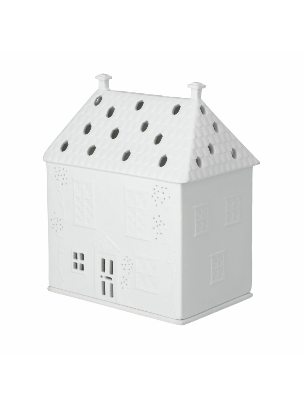 Tento veľkolepý porcelánový domček je stvorený pre tie najkrajšie večery. Bohato perforovaná strecha so štruktúrou škridiel prepúšťa hrejivé svetlo sviečky, zatiaľ čo detailne vyrezávané dvere a okná dodávajú dekorácii život. Fasádu zdobí jemný reliéf popínavých ruží, ktoré domčeku dodávajú romantický nádych starých panských sídiel.