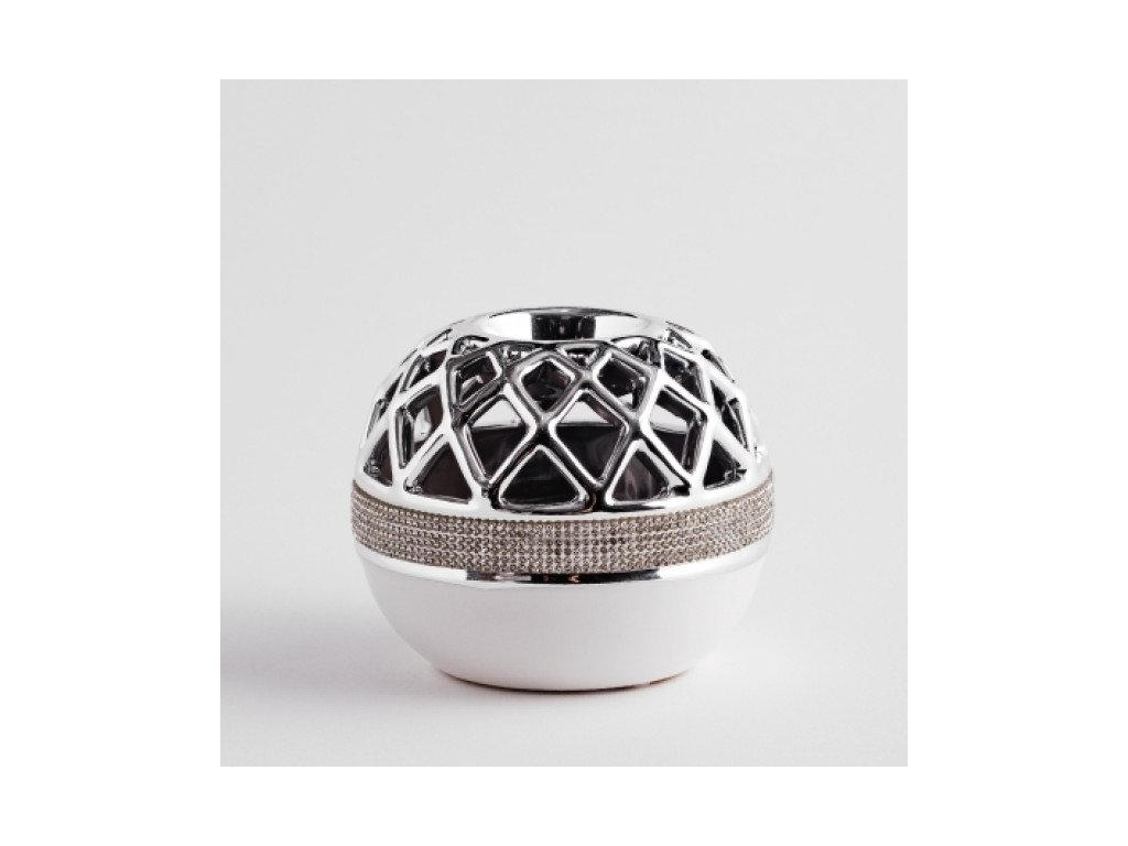 Krásny dekoratívny svietnik, ktorý zaujme svojím moderným a luxusným dizajnom. Spodná časť v bielej farbe je doplnená elegantným pásom trblietavých kamienkov, ktoré prechádzajú do prelamovaného kovového vrchu v striebornej farbe. Vďaka svojej geometrickej štruktúre a lesklému povrchu vytvára tento svietnik očarujúce svetelné efekty a dodáva interiéru sofistikovaný a štýlový nádych. Ideálny pre čajové sviečky, poslúži ako výrazná ozdoba na komode, poličke alebo jedálenskom stole.