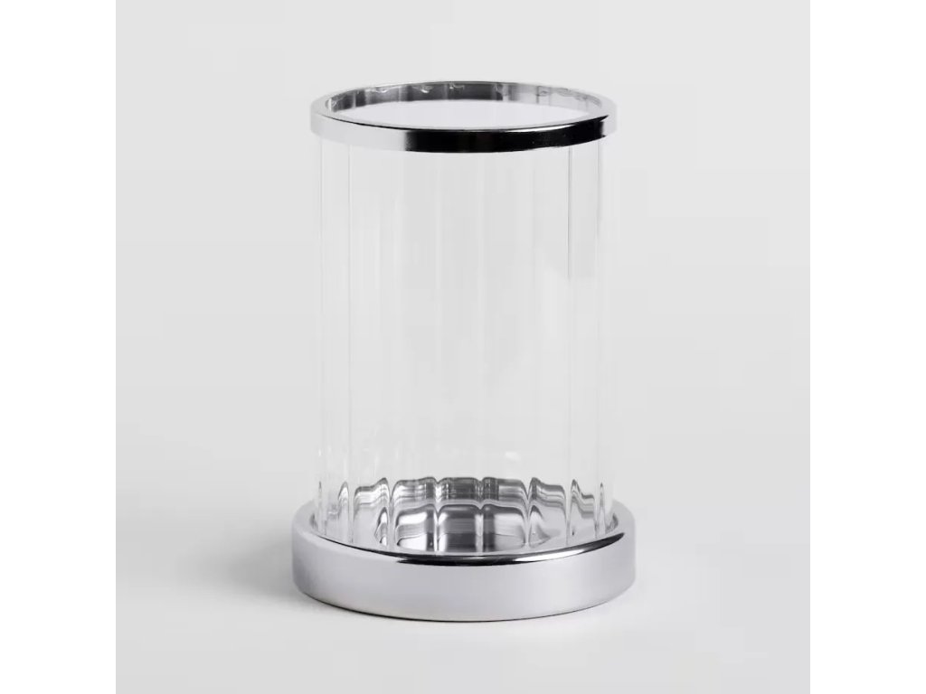 Štýlový sklenený svietnik so striebornými železnými prvkami je ideálnou voľbou pre tých, ktorí oceňujú elegantné a funkčné doplnky. Tento svietnik, určený na použitie so stĺpovou sviečkou, predstavuje rafinovanú kombináciu transparentného skla a lesklých kovových prvkov, ktoré mu dodávajú jedinečné čaro. Strieborné železné vložky zdôrazňujú moderný charakter svietnika, vďaka čomu je ideálnym doplnkom moderného interiéru. Výborne sa hodí ako centrálny dekoratívny prvok na stole, komode alebo poličke, vytvára útulnú atmosféru a vnáša do miestnosti nádych luxusu.