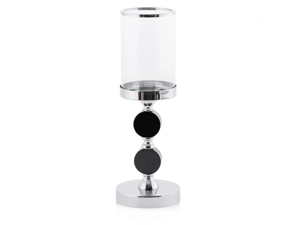 Pôsobivý svietnik v modernom dizajne, ktorý spája lesklý chróm s elegantnou čiernou a priehľadným sklom. Tento svietnik má robustnú chrómovú základňu a rovnako lesklú stredovú tyč, ktorá je predelená dvoma výraznými čiernymi guľami, dodávajúcimi mu sofistikovaný a grafický vzhľad. Vrchol tvorí valcový sklenený priehľadný kryt, ideálny na umiestnenie stĺpovej sviečky, ktorá je tak chránená a zároveň šíri príjemné svetlo. Svietnik kombinuje materiály ako kov (chróm), sklo a pravdepodobne lakované drevo alebo plast pre čierne gule. S výškou 35 cm a priemerom 12 cm je dostatočne vysoký na to, aby sa stal výrazným dekoratívnym prvkom na stole, komode alebo parapete, a vnesie do priestoru modernú eleganciu a útulnú atmosféru.