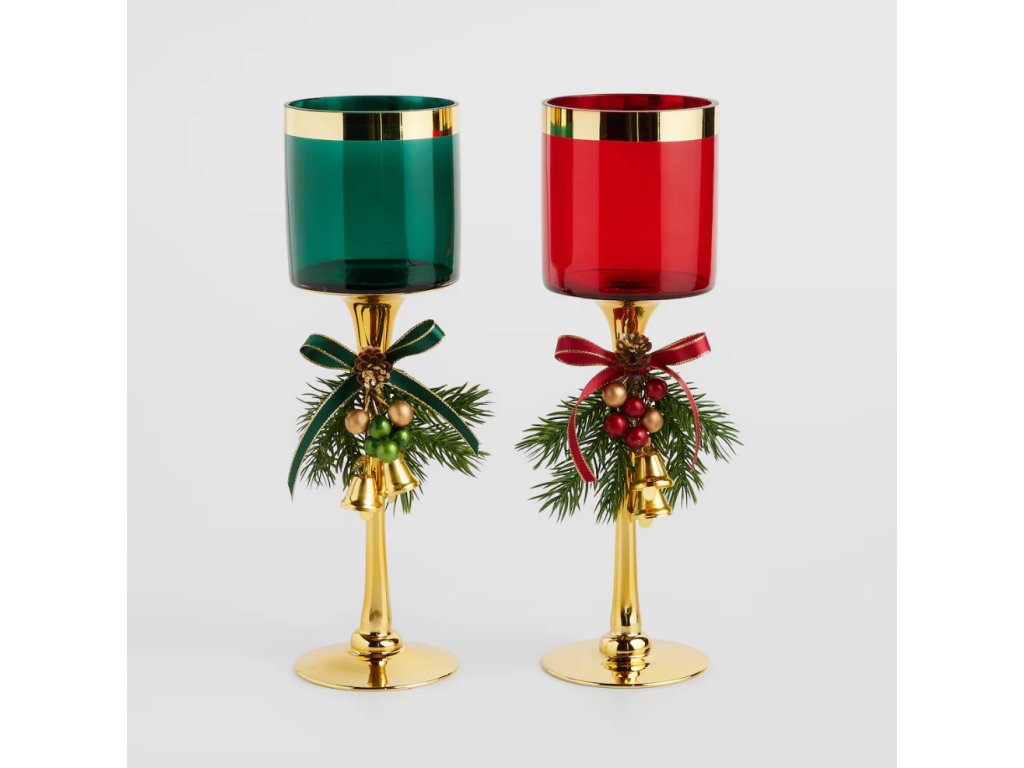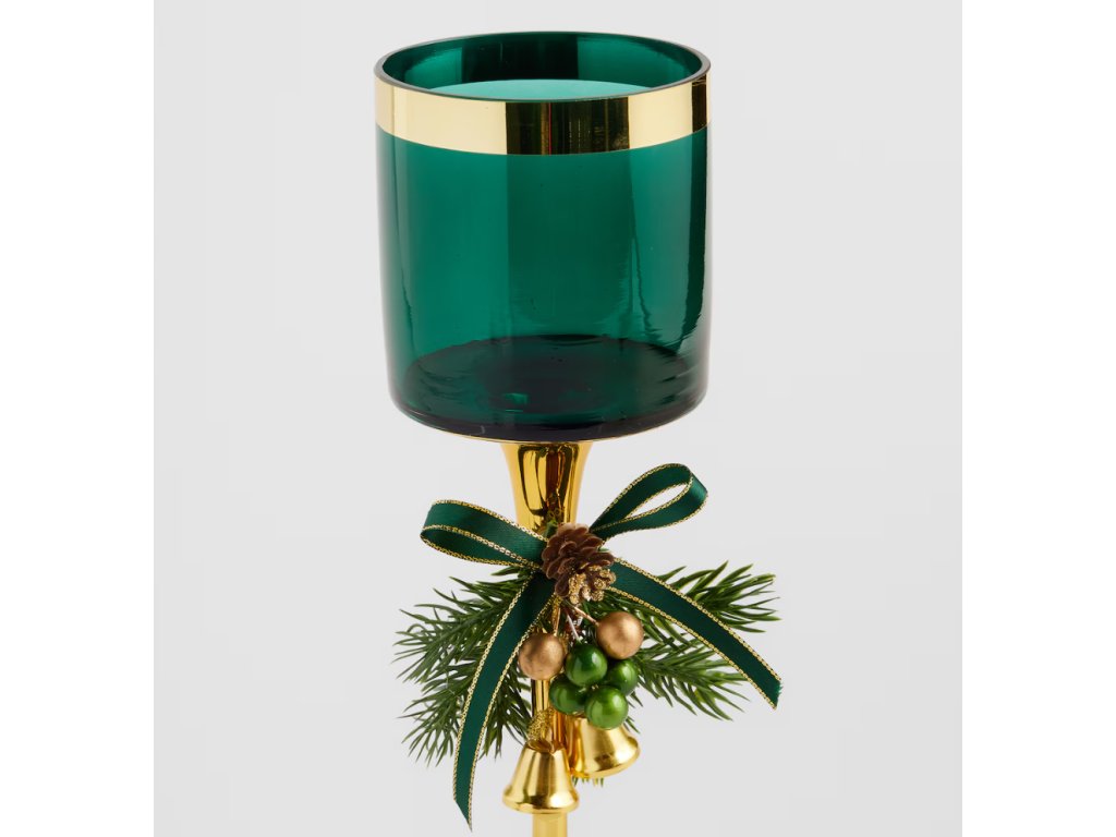 Oživte svoju vianočnú výzdobu týmto vysokým, elegantným svietnikom, ktorý spája kráľovské farby Vianoc – zlatú a sýto zelenú. Svietnik je ručne vyrobený a stojí na lesklom, zlatom podstavci, ktorý nesie vysoký smaragdovo zelený sklenený kalich pre čajovú sviečku (tealight). Kalich má elegantný zlatý okraj. Dekorácia je bohato zdobená: vetvičkami, ligotavými zelenými a zlatými bobuľami, drobnou šiškou a zlatými roľničkami, previazanými mašľou. So svojou výškou (predpokladáme cca ) sa stane dominantným a sofistikovaným prvkom sviatočného stola, ktorý vnesie do priestoru hĺbku a sviatočnú eleganciu.