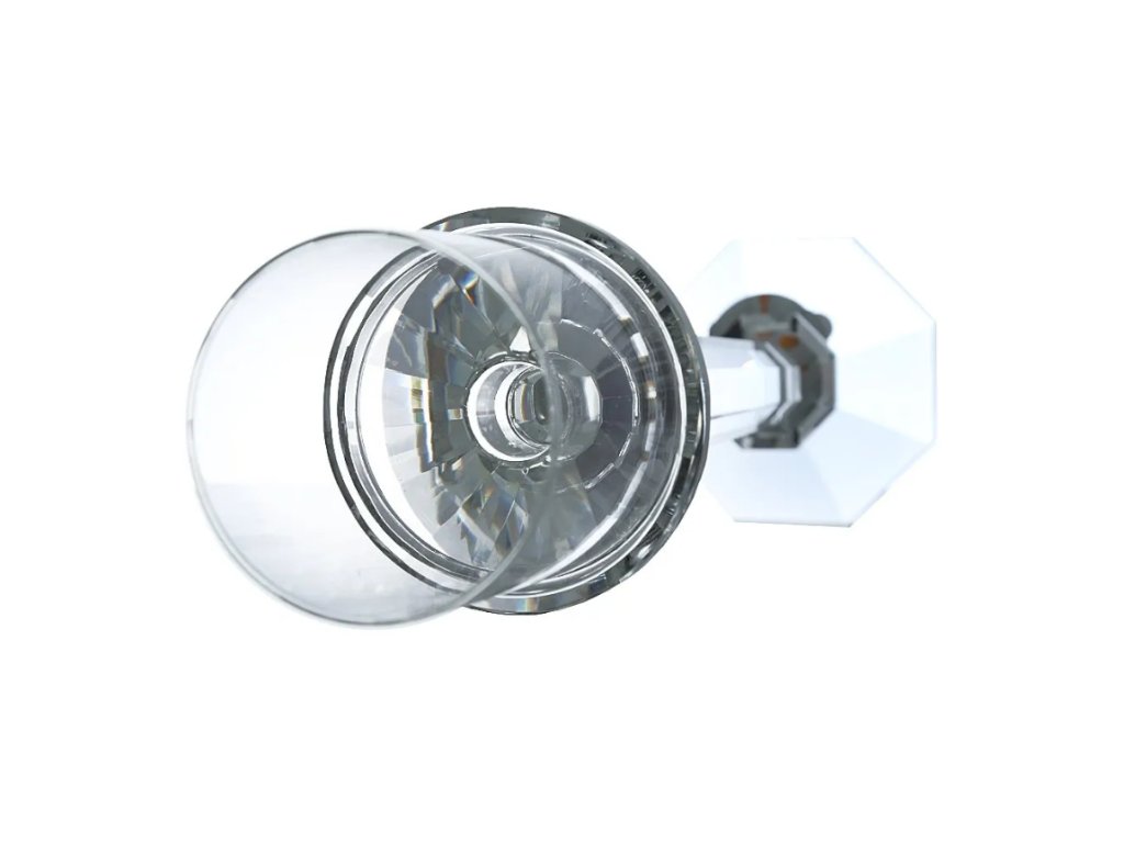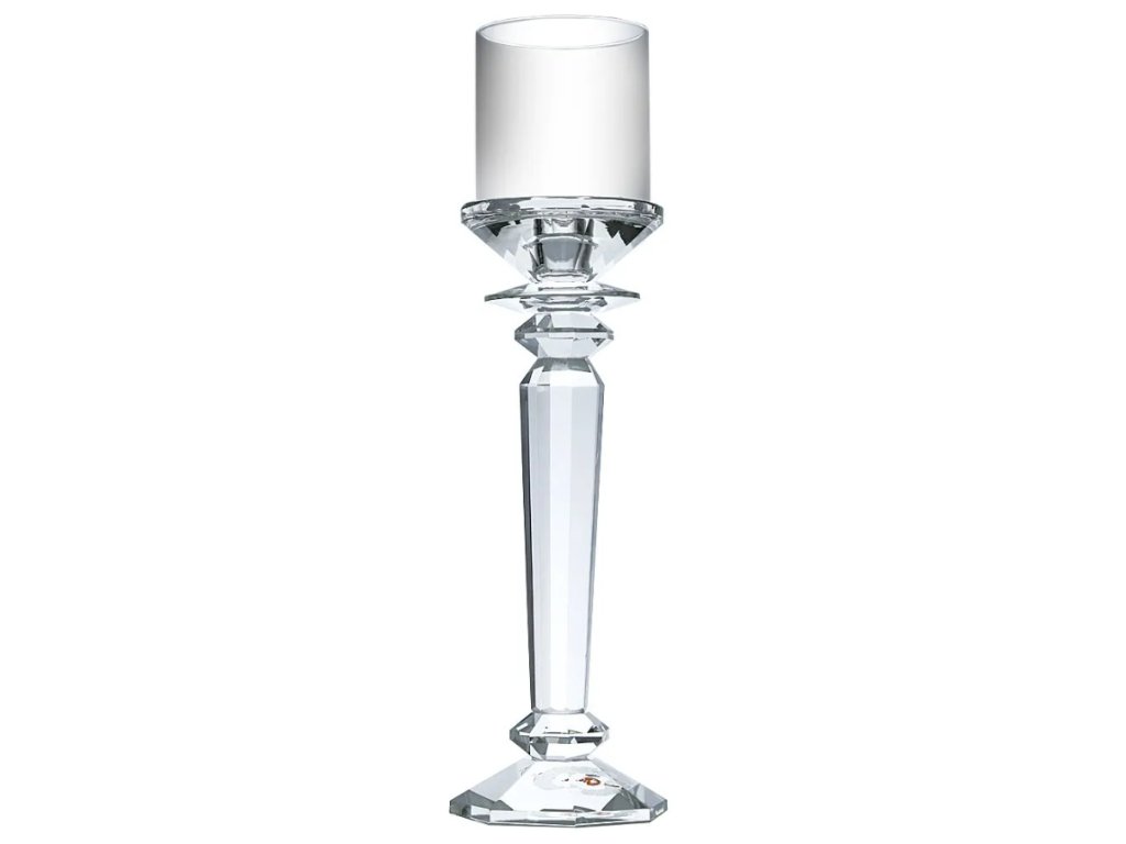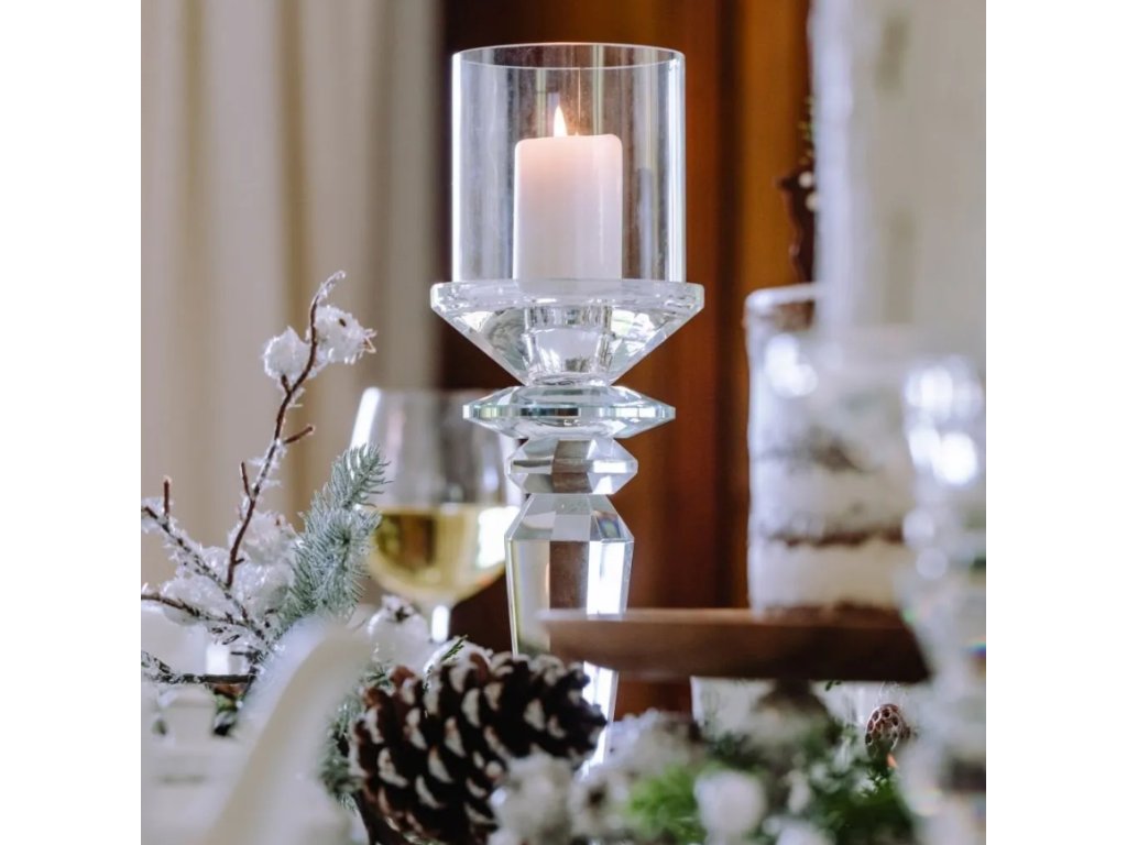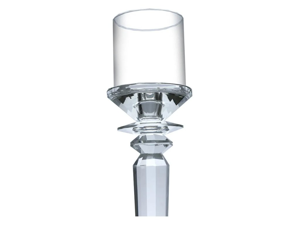 Jeho štíhla silueta a krištáľová báza s geometrickými fazetami z neho robia nápadný a vkusný dekoračný akcent.