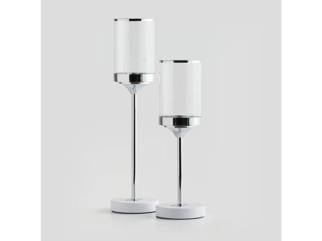 Elegantný svietnik z kovu a skla v striebornej farbe, s výškou 37,5 cm a priemerom 12 cm. Je vynikajúci na vytváranie náladového osvetlenia, ideálny ako štýlový doplnok do rôznych interiérov.