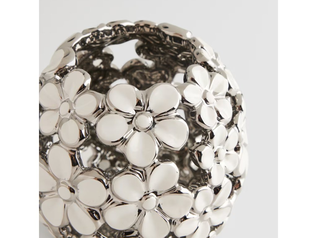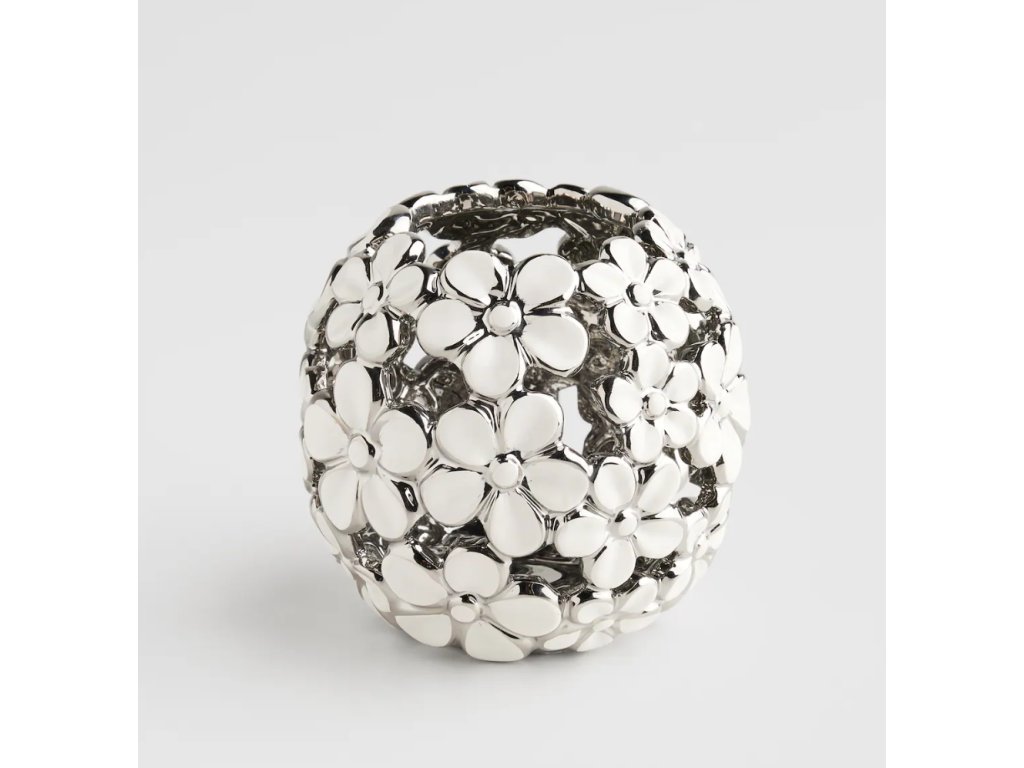 Rozžiarte miestnosť v štýle glamour! Tento keramický svietnik (Ø 12 cm) v lesklej, svetlej striebornej farbe je zdobený plastickým kvetinovým motívom. Galvanizovaný povrch nádherne odráža svetlo čajovej sviečky (tealight), vytvárajúc v interiéri luxusnú a príjemnú atmosféru. Ideálny pre stoly, police alebo krbové rímsy.