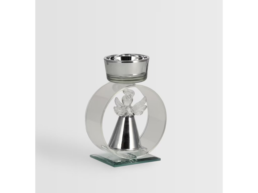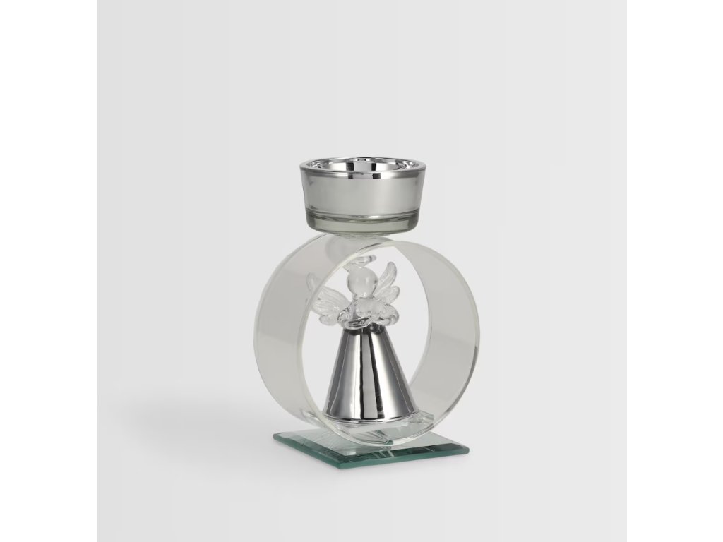 Tento elegantný svietnik vnesie do vášho domova jemné svetlo a pocit pokoja, či už ako vianočná dekorácia alebo celoročný doplnok. Svietnik je vyrobený zo skla, s hlavným dekoratívnym prvkom – krištáľovým anjelom – umiestneným vo vnútri elegantného skleneného oblúka. Anjelik stojí na striebornom (postriebrenom) podstavci kónického tvaru, ktorý odráža svetlo. Vrchná časť slúži ako kalich na čajovú sviečku (tealight) a je taktiež vyhotovená v lesklom striebornom tóne. S výškou je ideálny na poličku, nočný stolík alebo ako decentný a sofistikovaný prvok sviatočnej tabule.