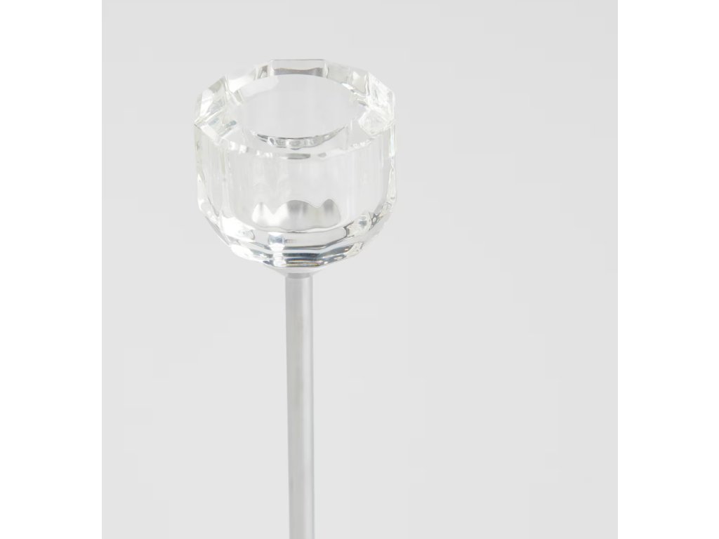 Tento štýlový, postriebrený svietnik v kratšej verzii je dokonalým doplnkom pre elegantné prestieranie alebo dekoráciu. Vyznačuje sa štíhlym, lešteným železným stĺpikom a stabilnou kruhovou základňou, ktorá odráža svetlo. Držiak na sviečku je vyrobený z priehľadného skla, ktoré je určené pre dlhé sviečky. S výškou 18 cm je ideálny na vytvorenie decentnej, no očarujúcej atmosféry na polici, príborníku, alebo v strede stola, kde pôsobí minimalisticky a luxusne zároveň.