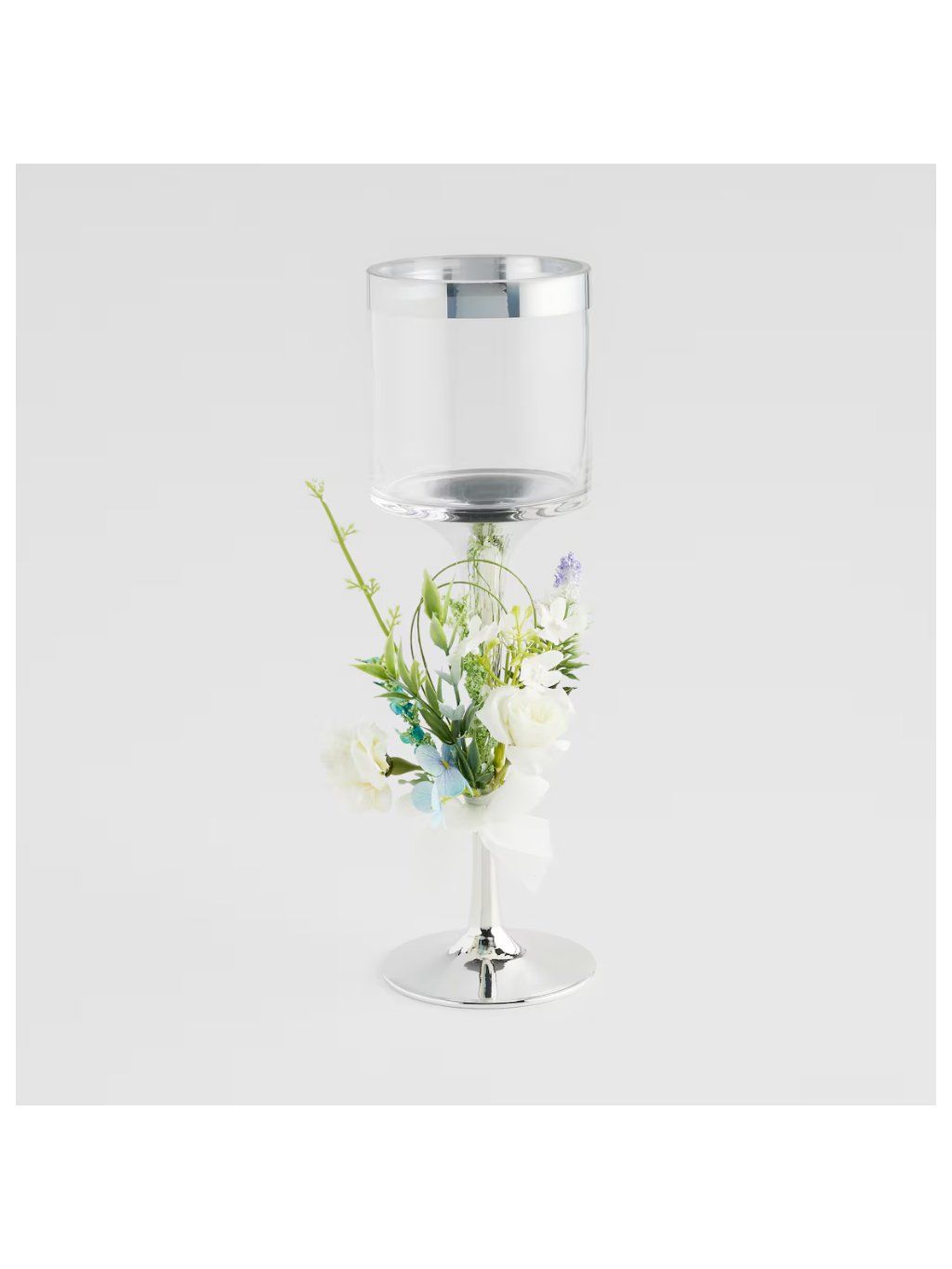 Strieborný, žiariaci akcent povrchovej úpravy dokonale ladí s čírym sklom a rastlinnou dekoráciou v podobe umelých bielych ruží, levandule, hortenzií a jemnej stuhy. Moderný dizajn spája klasickú formu kalicha na vysokej nohe s floristickými detailmi. Vďaka tomu sa svietnik Lentia skvele hodí do elegantných aj moderných interiérov. Je vynikajúcou ozdobou na stôl, komodu alebo ako dekorácia počas rodinných osláv a sviatkov. Ideálny aj ako darček pre milovníkov štýlových bytových doplnkov.