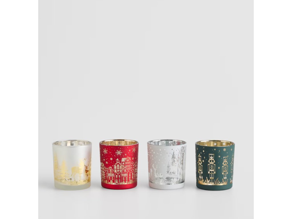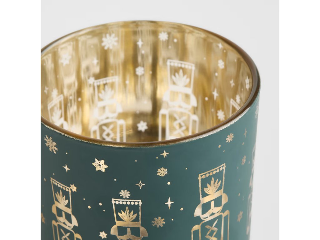 Vneste do svojho domova kúsok rozprávkovej klasiky s týmto elegantným skleneným svietnikom v tmavozelenej farbe. Svietnik má matný povrch, na ktorom vyniká zlatá potlač s motívom ikonického vianočného symbolu – Luskáčika. Postavy Luskáčikov v rade, spolu s drobnými snehovými vločkami, vytvárajú dokonalú sviatočnú scénu. Vnútro svietnika je pre maximálny odraz svetla pozlátené a po zapálení čajovej sviečky sa motív krásne rozžiari. Tento svietnik v tradičnom štýle, s priemerom okolo $\text{7-9 cm}$, je ideálny na vytvorenie teplého a nostalgického akcentu na vianočnom stole alebo krbovej rímse.