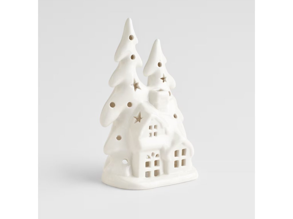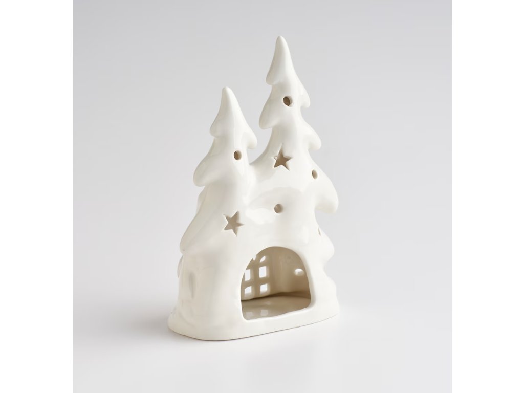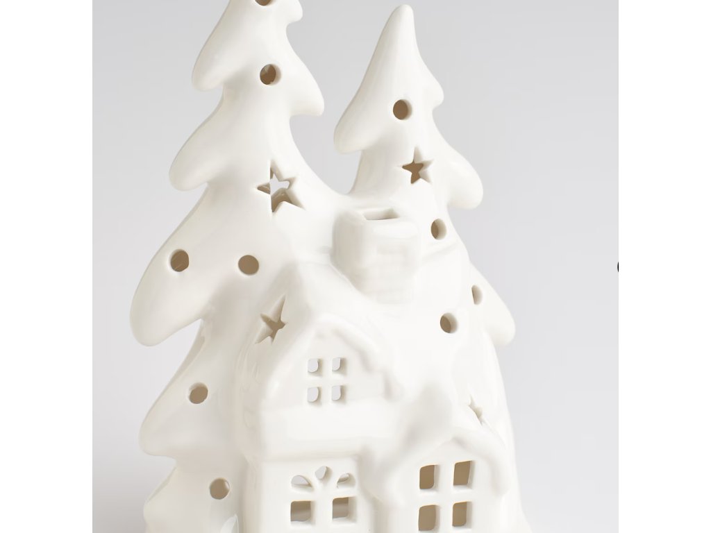Vytvorte si vo svojom domove čarovnú atmosféru s týmto keramickým svietnikom na čajovú sviečku. Tradičný biely domček so zasneženou strechou a vianočnými stromčekmi, vyrobený z glazovanej kameniny, je prežiarený svetlom, ktoré preniká cez otvory v tvare okien, hviezdičiek a bodiek. Svetlo z čajovej sviečky vytvorí útulný, teplý lesk, ideálny na dlhé zimné večery. Tento svietnik je krásny dekoračný prvok, ktorý sa hodí do akéhokoľvek interiéru a podčiarkne sviatočný charakter priestoru.