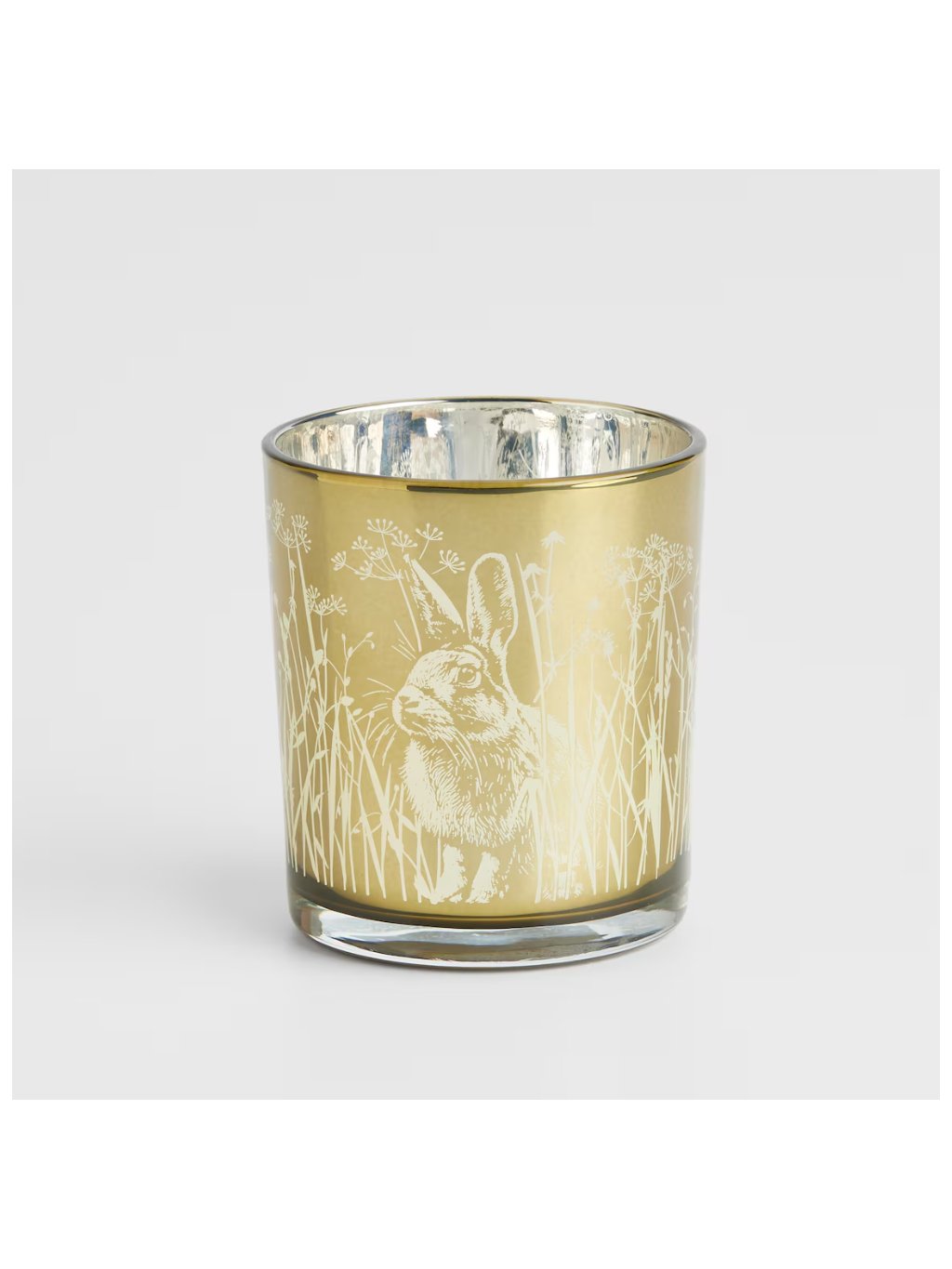 Sklenený svietnik s výškou 10 cm zdobí detailný motív králika uprostred lúčnych kvetov. Po zapálení čajovej sviečky sa zlatý povrch rozžiari a vytvorí v miestnosti útulnú a hrejivú atmosféru.