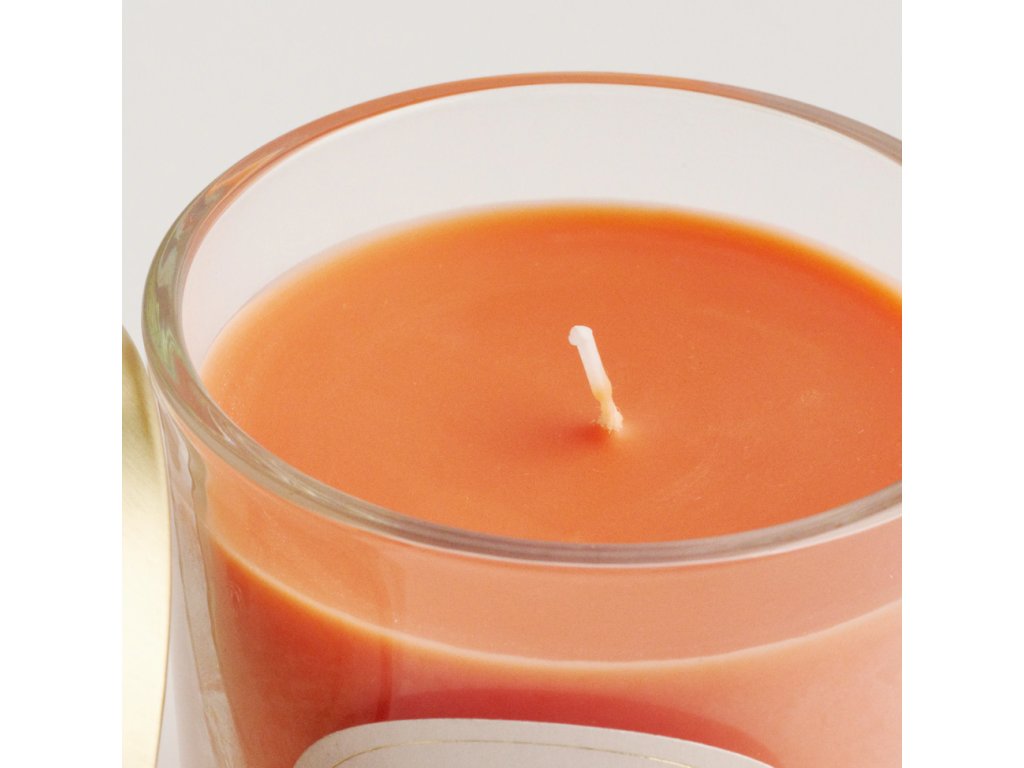 Vonnná sviečka v oranžovej farbe, umiestnená v sklenenej nádobe. Je aromatická a dekoračná, ideálna na vytvorenie hrejivej a útulnej atmosféry.