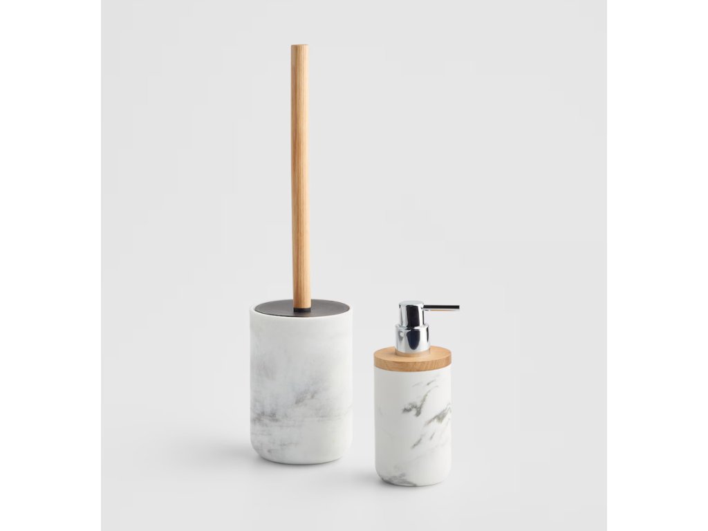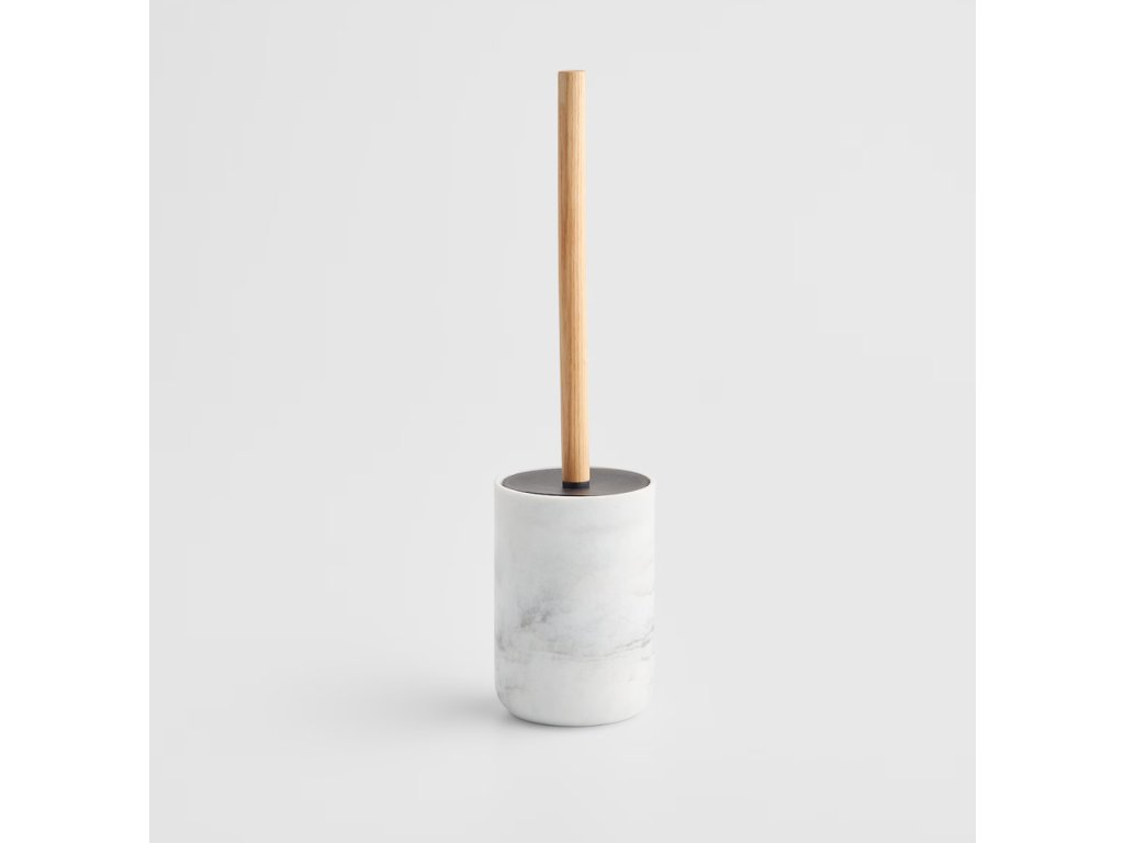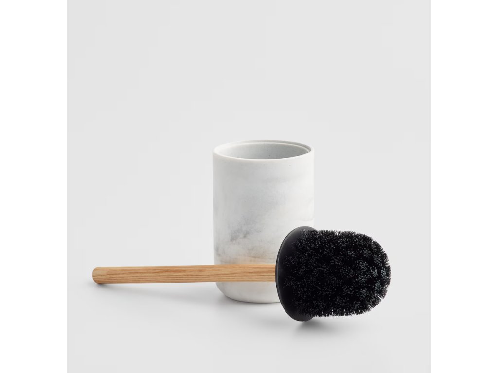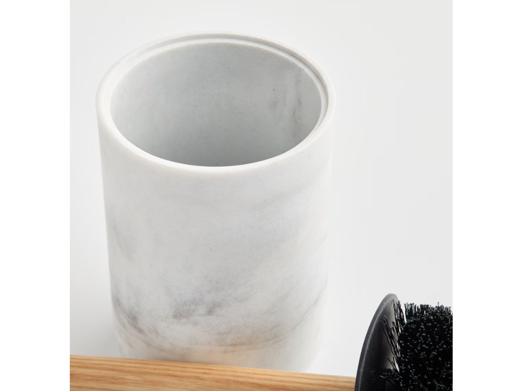 Nádoba na kefu je vyrobená z trvácnej živicovej hmoty, ktorá imituje elegantný mramor. Prírodný akcent tvorí rúčka zo vznešeného jaseňového dreva, príjemného na dotyk a odolného voči vlhkosti. Štetiny kefy z PP (polypropylénu) zaručujú účinnosť a hygienu. Trvácnosť materiálov zabezpečuje dlhoročné používanie a ich odolnosť voči vlhkosti robí kefu ideálnou do kúpeľne.
