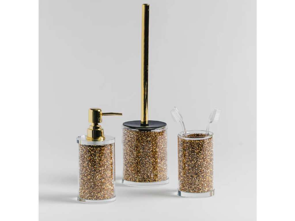 Nádoba na kefu je vyrobená z vysokokvalitného skla, ktoré zaisťuje trvácnosť a jednoduchú údržbu. Zlatá rukoväť kefy je kombináciou plastu (ABS) s metalickým povrchom, ktorý zaručuje odolnosť a odolnosť voči korózii. Sklenený povrch nádoby je zdobený trblietkami, ktoré mu dodávajú jedinečný, lesklý charakter.