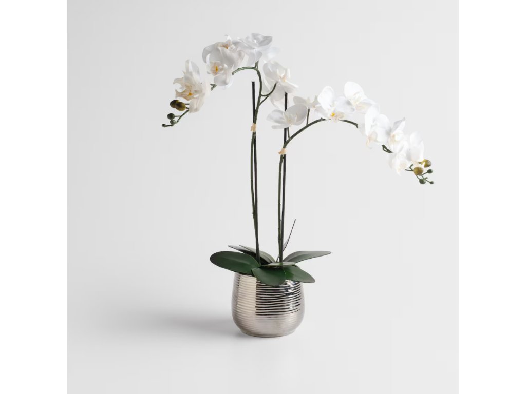 Vytvorte si luxusný a harmonický domov s doplnkami, ktoré spájajú čistú bielu a žiarivé striebro. Realistická orchidea v striebornom kvetináči vnesie do priestoru pôvab a sviežosť, zatiaľ čo zdobená dolomitová miska s kvetinovým motívom je dokonalým akcentom pre váš konferenčný stolík.