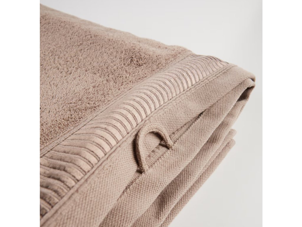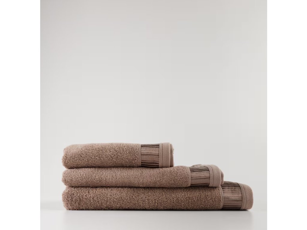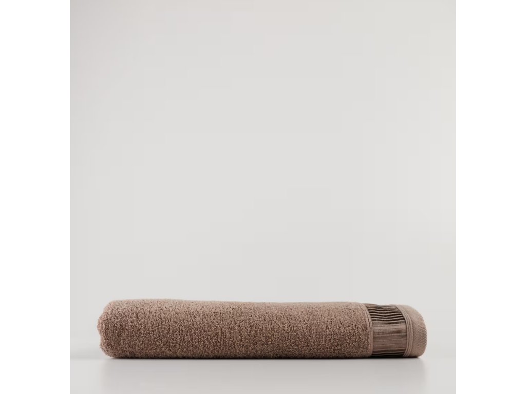 Tmavobéžový uterák vyrobený z bavlny s prídavkom viskózy je kombináciou výnimočnej mäkkosti a dokonalej savosti. Veľký rozmer 100x150 cm zabezpečuje pohodlie a komfort počas každodenného používania. Prírodné bavlnené vlákna zaručujú trvácnosť a prídavok viskózy mu dodáva elegantný lesk a jemnosť. Je to ideálna voľba do kúpeľne, ktorá spája funkčnosť s estetikou.
