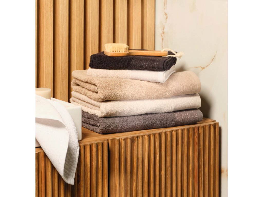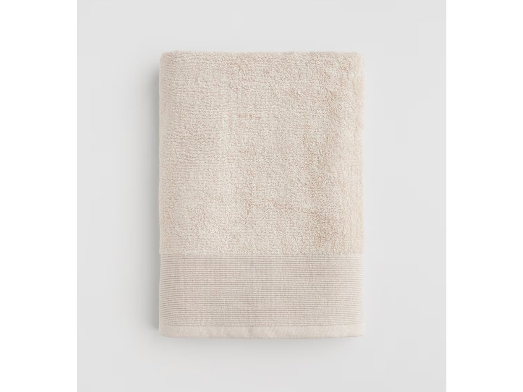 Kúpeľňový uterák v svetlobéžovej farbe s rozmermi 70 x 130 cm je praktickým a štýlovým prvkom do každej kúpeľne. Je vyrobený zo 100 % bavlny s gramážou 450 g/m², čo zaručuje príjemnú mäkkosť, dobrú savosť a rýchle schnutie. Jeho stredná veľkosť sa osvedčí doma, ako aj v telocvični alebo pri bazéne. Jemný svetlobéžový odtieň dodá interiéru ľahkosť a eleganciu, pričom dokonale ladí s rôznymi štýlmi interiérového dizajnu. Prírodné vlákna sú šetrné k pokožke a odolné voči častému praniu.
