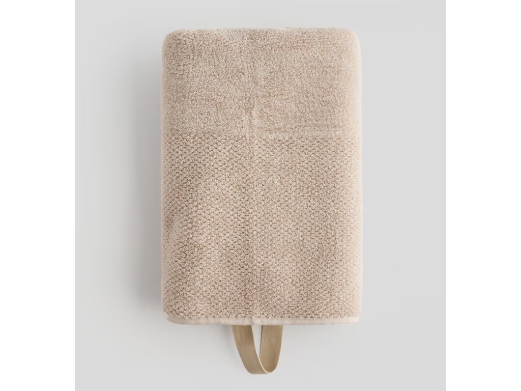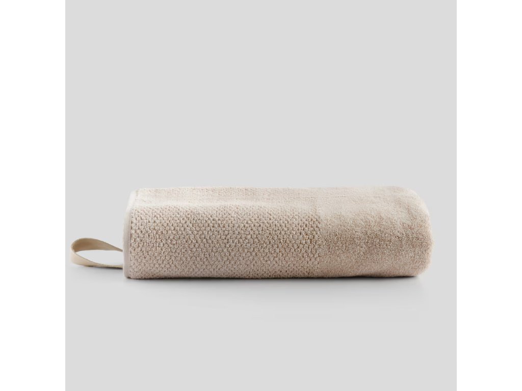Veľký, nadýchaný uterák z bavlny v elegantnej svetlobéžovej farbe. Jeho veľkosť zaručuje komfortné zabalenie po kúpeli a hustá väzba zabezpečuje vynikajúcu savosť, mäkkosť a trvácnosť. Je ideálny na každodenné použitie, spája v sebe funkčnosť s klasickým štýlom.
