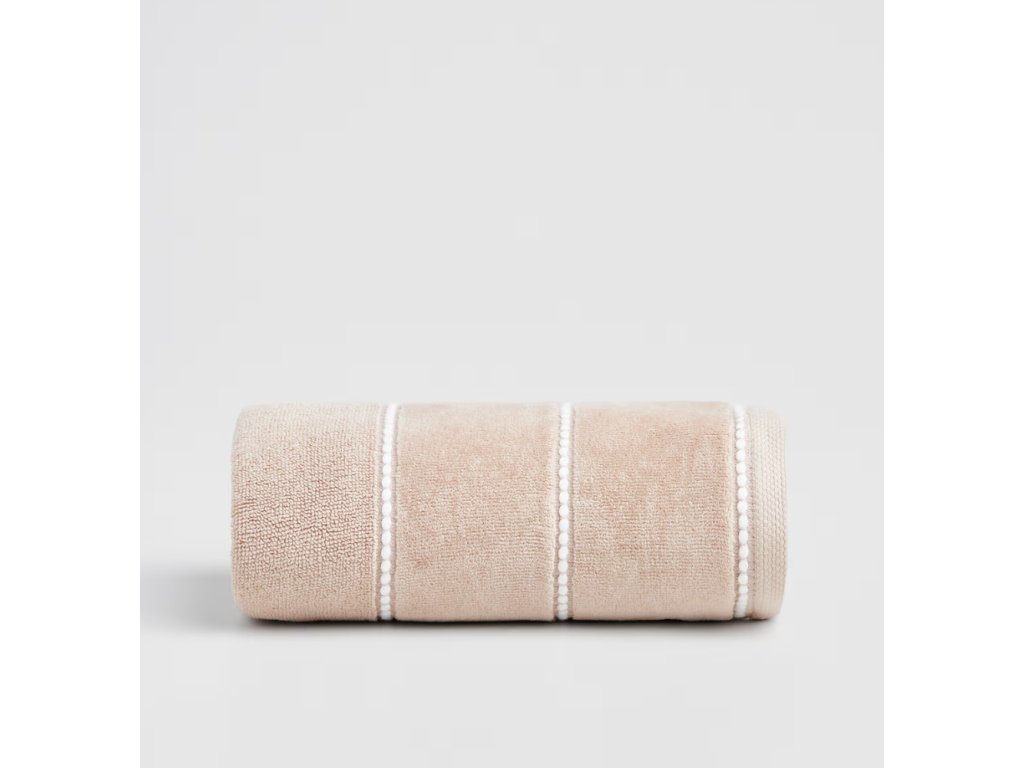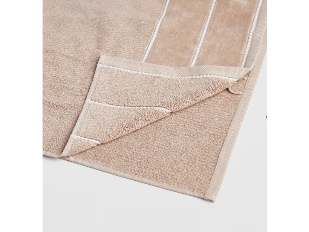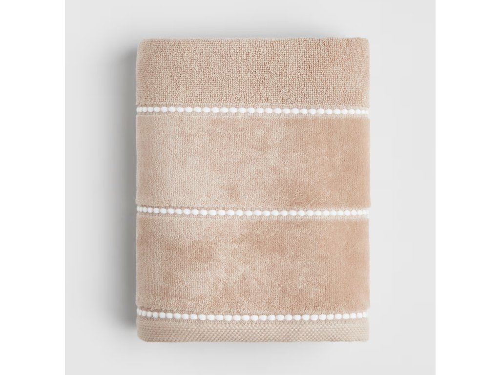 Uterák Velly 50x90 cmsa vyznačuje pokojnou, svetlobéžovou farbou, ktorú obohacujú tri ozdobné pásy s bielymi drobnými výstupkami inšpirovanými textúrou piesku a vĺn tvoriacich subtílne línie.