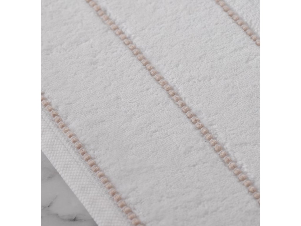 Jemná, biela farba uteráka s rovnomernými horizontálnymi pásmi v odtieňoch béžovej a sivej subtílne odráža svetlo, vďaka čomu uterák vnáša sviežosť do každej kúpeľne.
