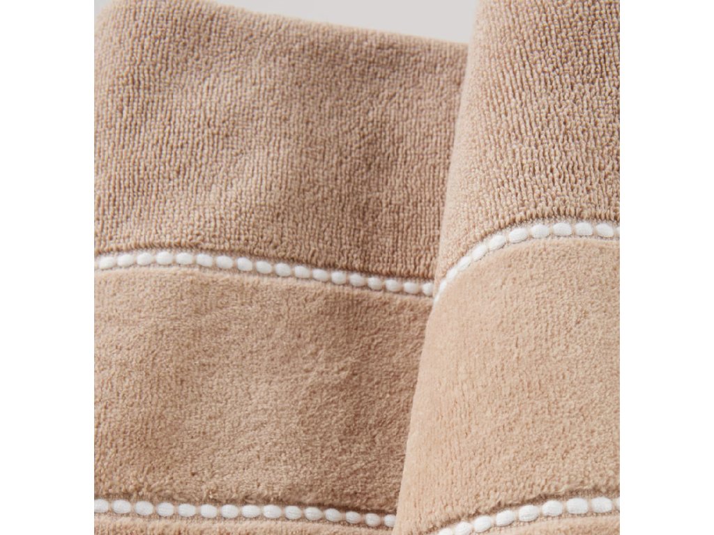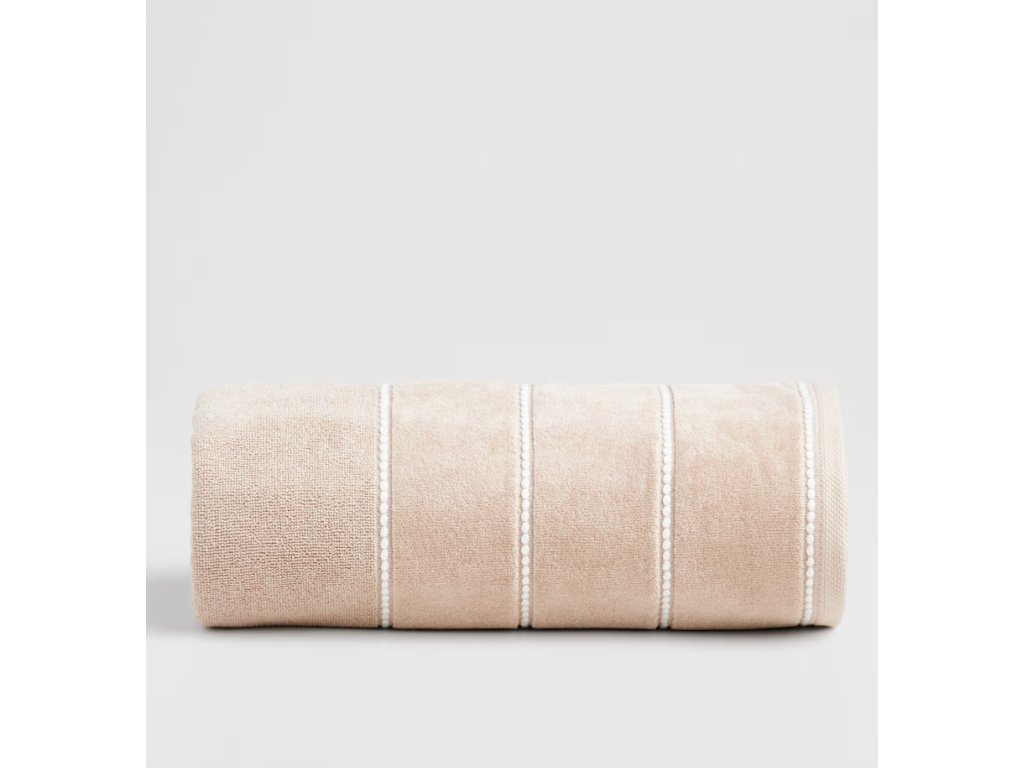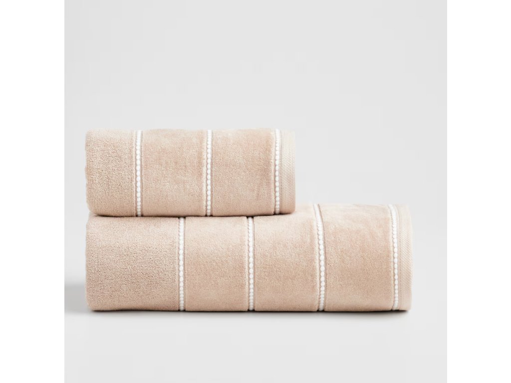 Uterák Velly 90x140 cm sa vyznačuje pokojnou, svetlobéžovou farbou, ktorú obohacujú tri ozdobné pásy s bielymi drobnými výstupkami inšpirovanými textúrou piesku a vlnami tvoriacimi subtílne línie. Použitie klasických farieb a starostlivé obšitie robia produkt vhodným pre rôzne aranžmány, či už moderné, alebo klasické. Každý detail podčiarkuje súlad formy a funkcie – uterák ozdobí kúpeľňu a poslúži aj ako elegantný darček.