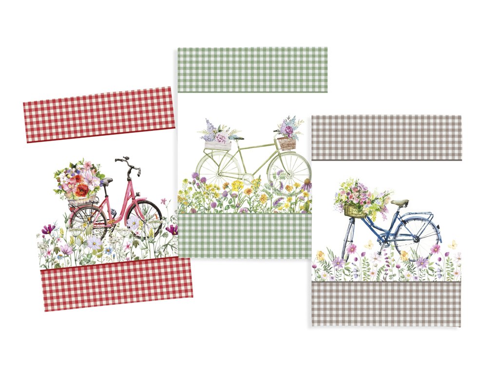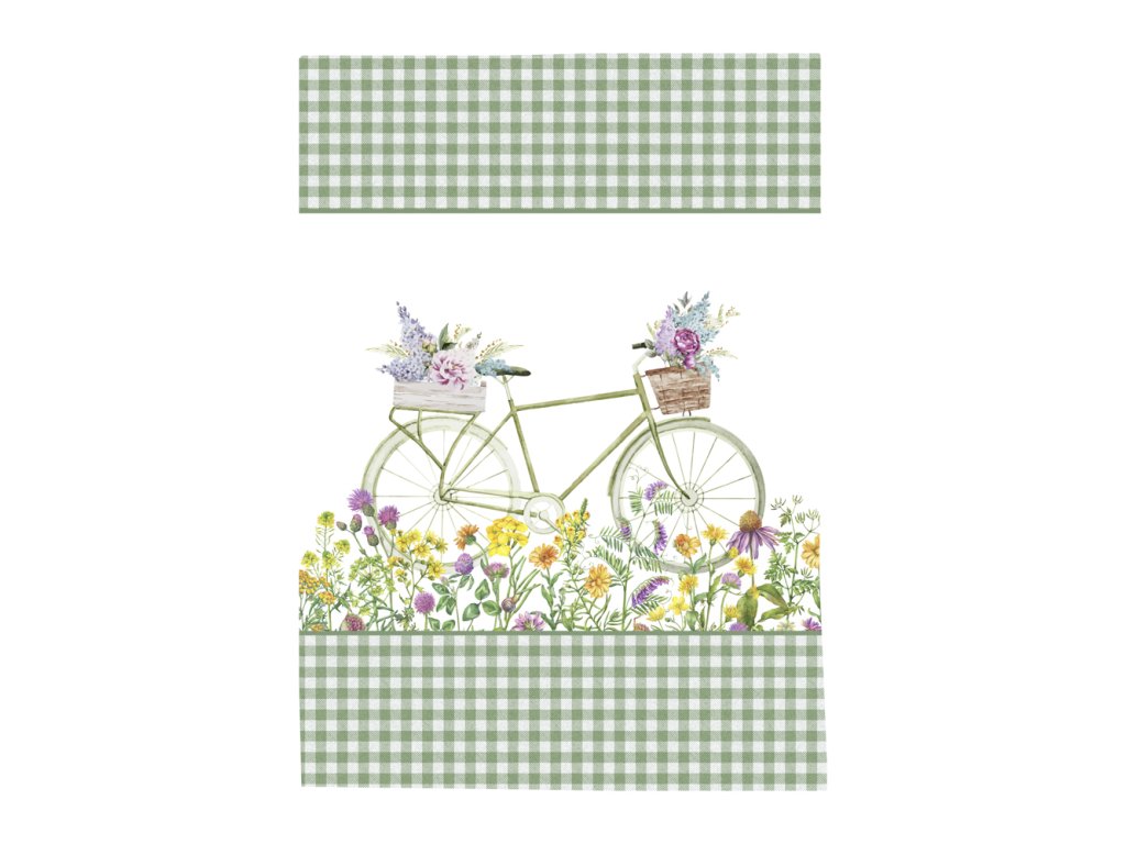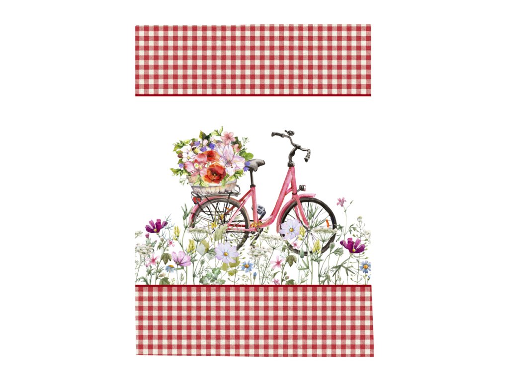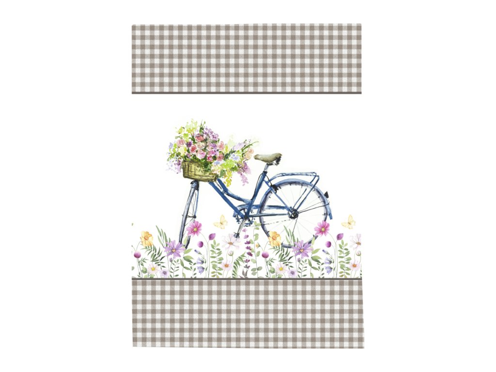 Táto kuchynská utierka s motívom, ktorý vnesie do vašej kuchyne kúzlo a šarm vidieka, je sfarbená do pastelových tónov. Jej strednú časť zdobí akvarelová ilustrácia so zelenkavým retro bicyklom, ktorého košíky sú naplnené pestrofarebnými kvetmi. Celú kompozíciu dokonale dopĺňajú prešívané, kockované okraje v jemnom zelenom odtieni. Utierka je vyrobená z mäkkej a savej bavlny, je praktická na každodenné použitie a ideálna pre milovníkov romantických doplnkov.