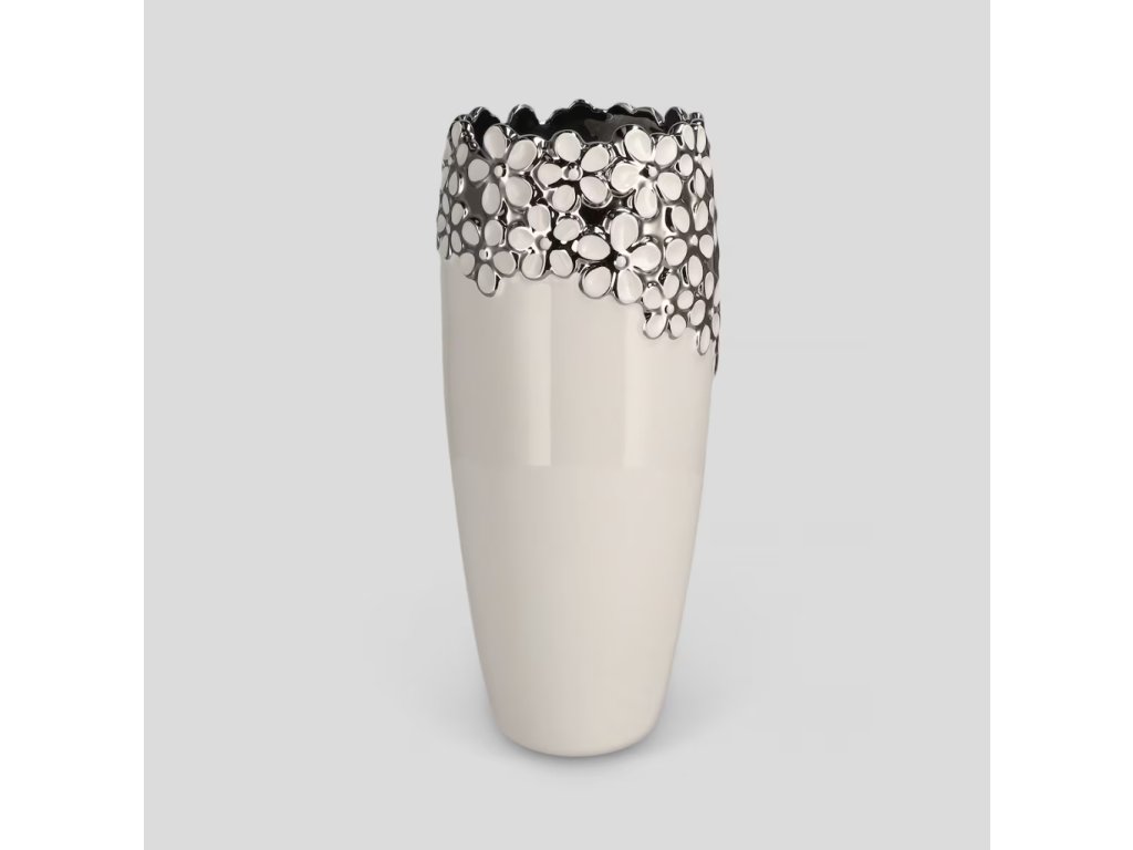 Glamour, aký si zaslúži Váš interiér! Biela váza Flosales s lesklým strieborným kvetinovým zdobením je kvintesenciou elegancie. Vnesie do obývačky alebo predsiene sofistikovaný lesk, a dokonale zvýrazní krásu kytice alebo elegantne vynikne sama o sebe.