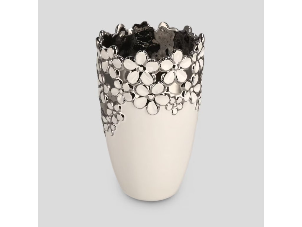 Malá, ale s veľkým štýlom! Táto elegantná biela váza s lesklým kvetinovým lemom prinesie nádych glamour do každého priestoru. Ideálna na menšie kytice, jednotlivé kvety alebo ako samostatný dekoračný prvok na poličke či nočnom stolíku. Jej kompaktné rozmery ju predurčujú do každého interiéru.