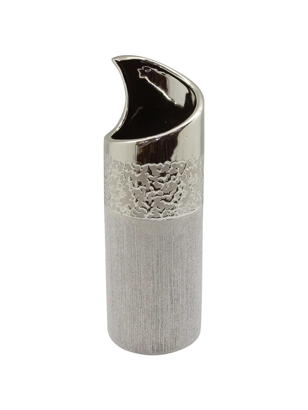 Keramická váza Grace (10 x 10 x 30 cm) v luxusnom strieborno-šampanskom prevedení kombinuje tri rôzne textúry s moderným asymetrickým hrdlom. Vďaka svojmu štíhlemu valcovitému tvaru a vysokému lesku je ideálnym dizajnovým prvkom do moderného interiéru.