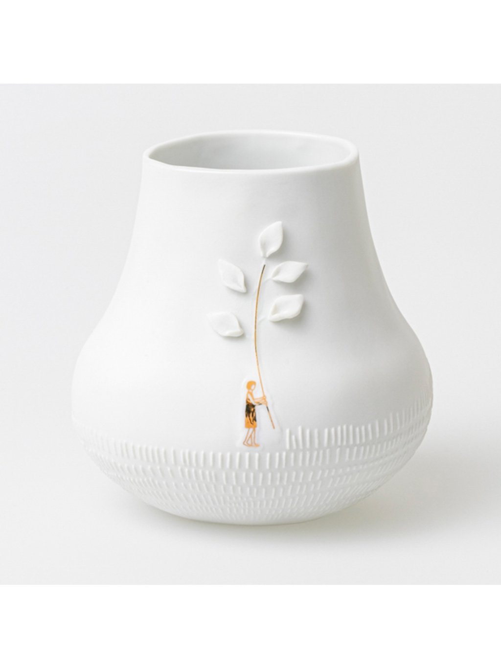 Hľadáte doplnok, ktorý hovorí sám za seba? Táto biela váza kombinuje minimalistický tvar s prepracovaným reliéfnym motívom. Zlatý akcent na stonke vetvičky podčiarkuje jej luxusný vzhľad, zatiaľ čo matný biely povrch zaručuje, že vynikne v akomkoľvek modernom interiéri.