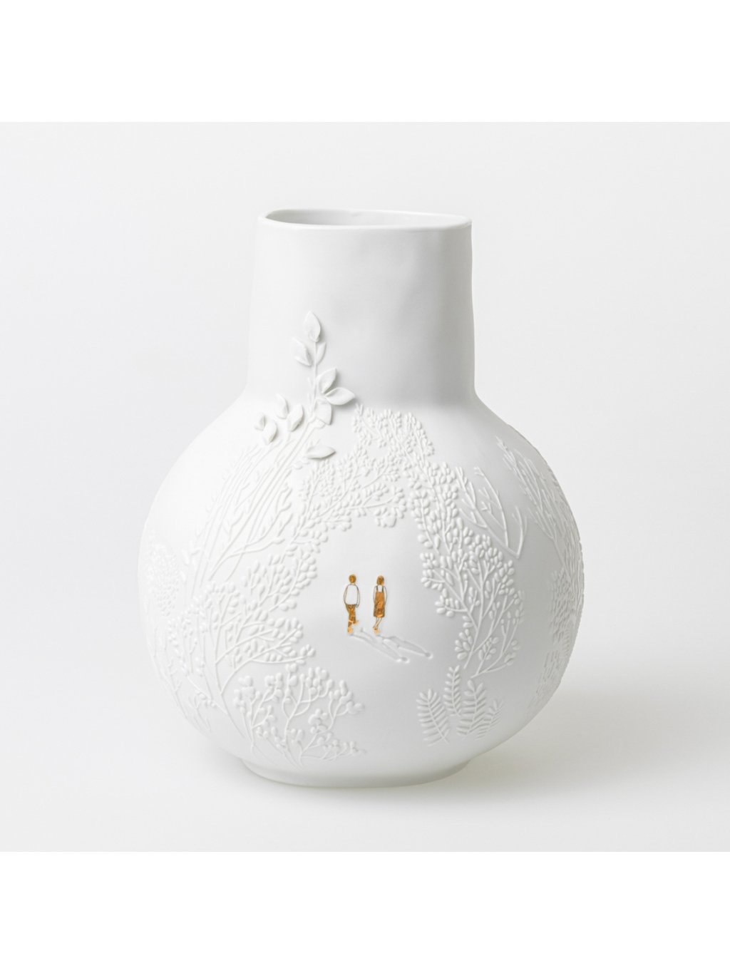 Biela matná váza, ktorá vás prinúti pristaviť sa a skúmať jej detaily. Bohatá textúra listov a konárov vytvára dokonalú kulisu pre drobný pár so zlatými akcentmi. Svojím oblým tvarom a čistým prevedením je ideálnym darčekom k výročiu alebo ako symbol spoločných chvíľ.