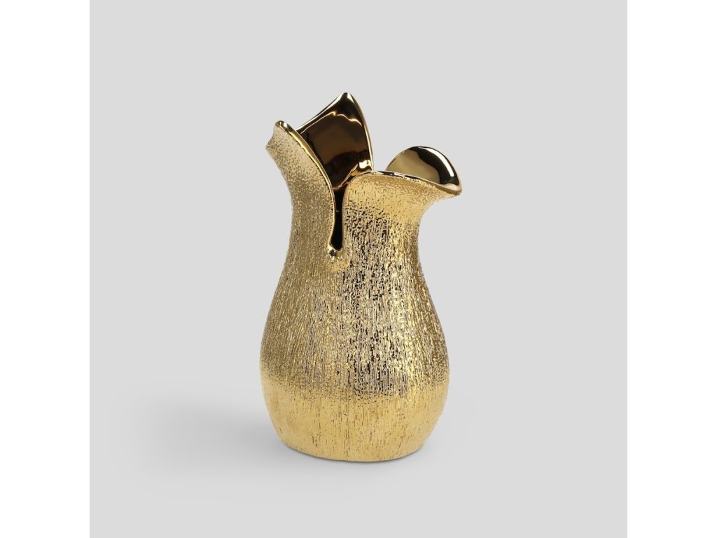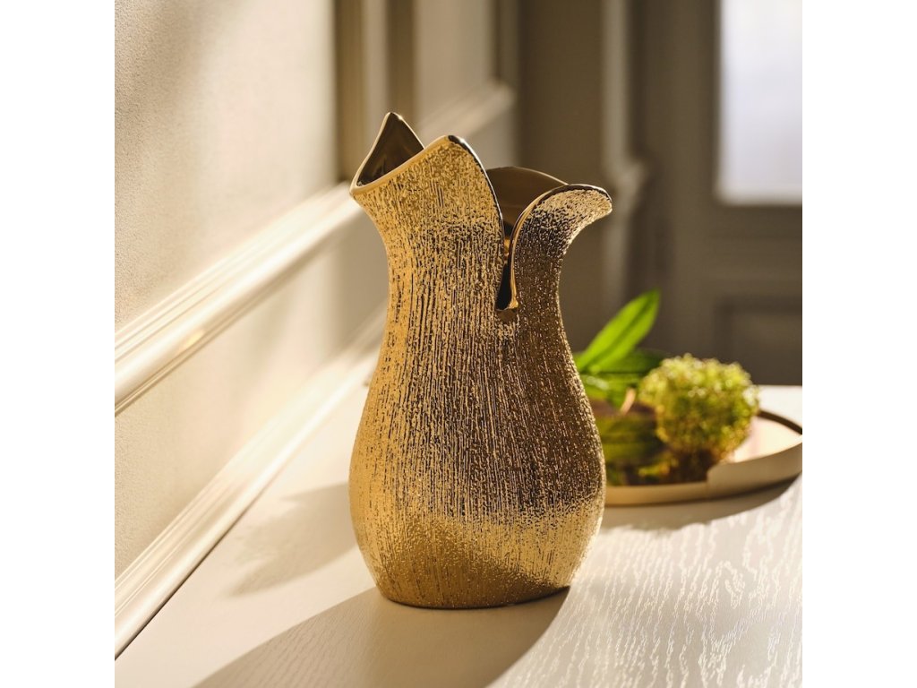 Elegantná keramická váza sa vyznačuje jemnou zlatou povrchovou úpravou, ktorá jej dodáva luxusný charakter. Vďaka štíhlemu tvaru je ideálna na rezané kvety alebo ako samostatný dekoratívny prvok. Jej univerzálny dizajn sa hodí do moderných aj klasických interiérov a prinesie nádych lesku a sofistikovanosti do každej miestnosti.