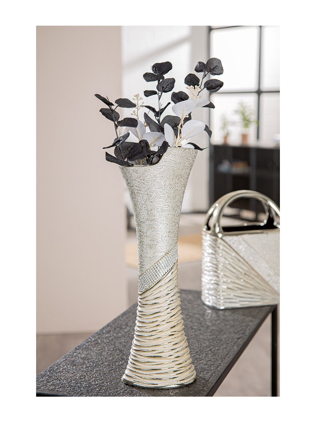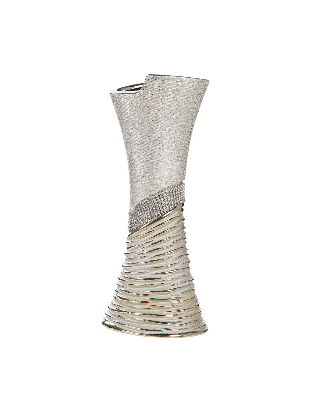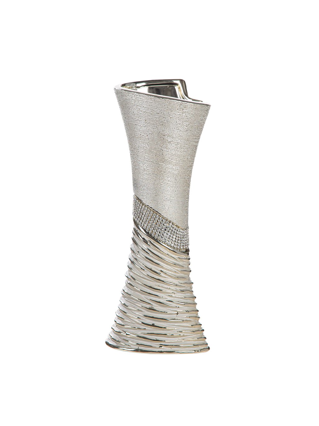 Exkluzívny vzhľad: Váza kombinuje tri rôzne textúry – jemne zrnitý strieborný povrch, trblietavý pás s kamienkami a dynamické reliéfne vlnovky v spodnej časti.