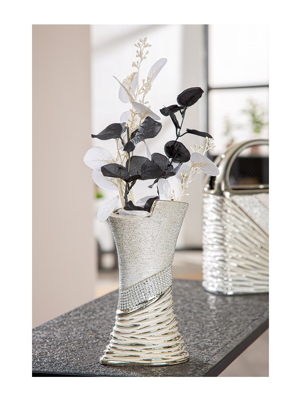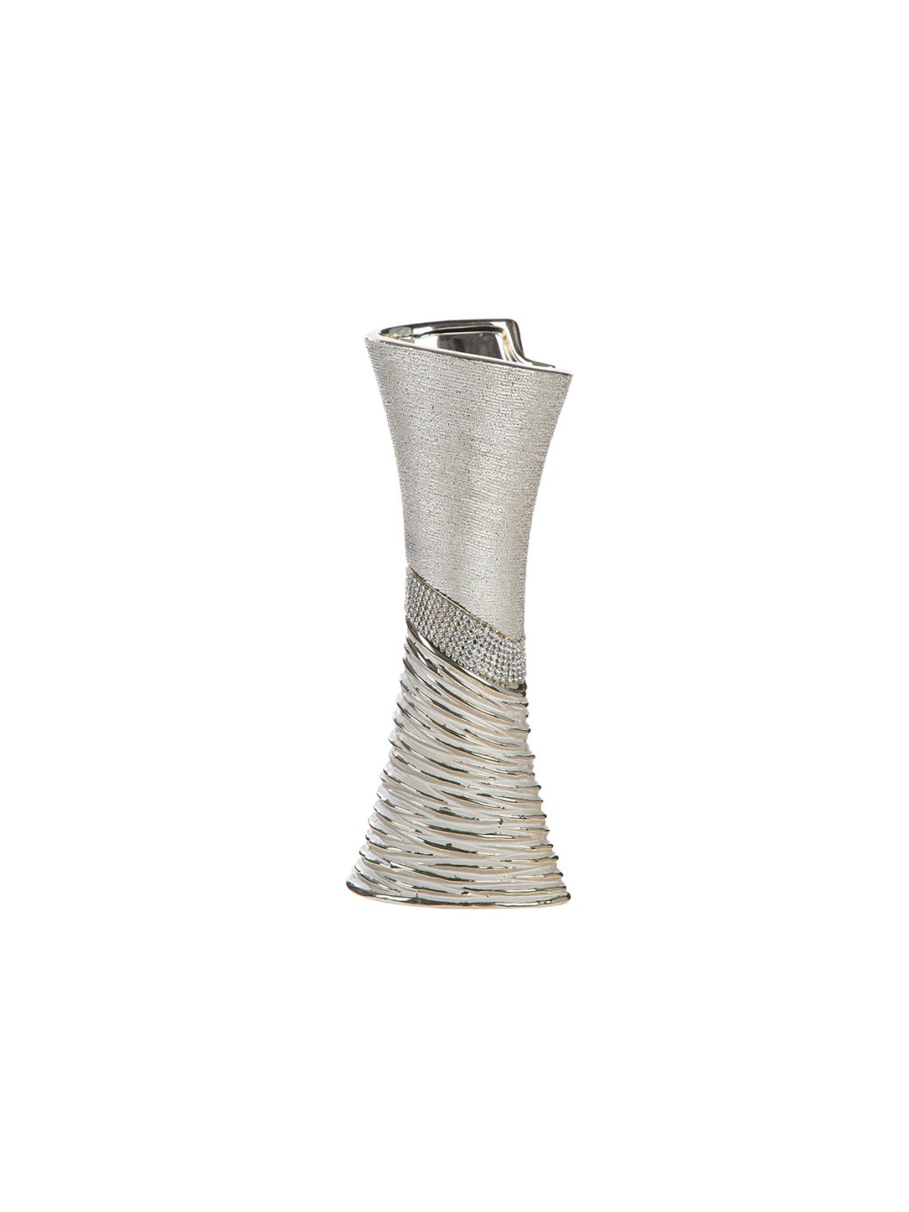 Exkluzívny vzhľad: Váza kombinuje tri rôzne textúry – jemne zrnitý strieborný povrch, trblietavý pás s kamienkami a dynamické reliéfne vlnovky v spodnej časti.