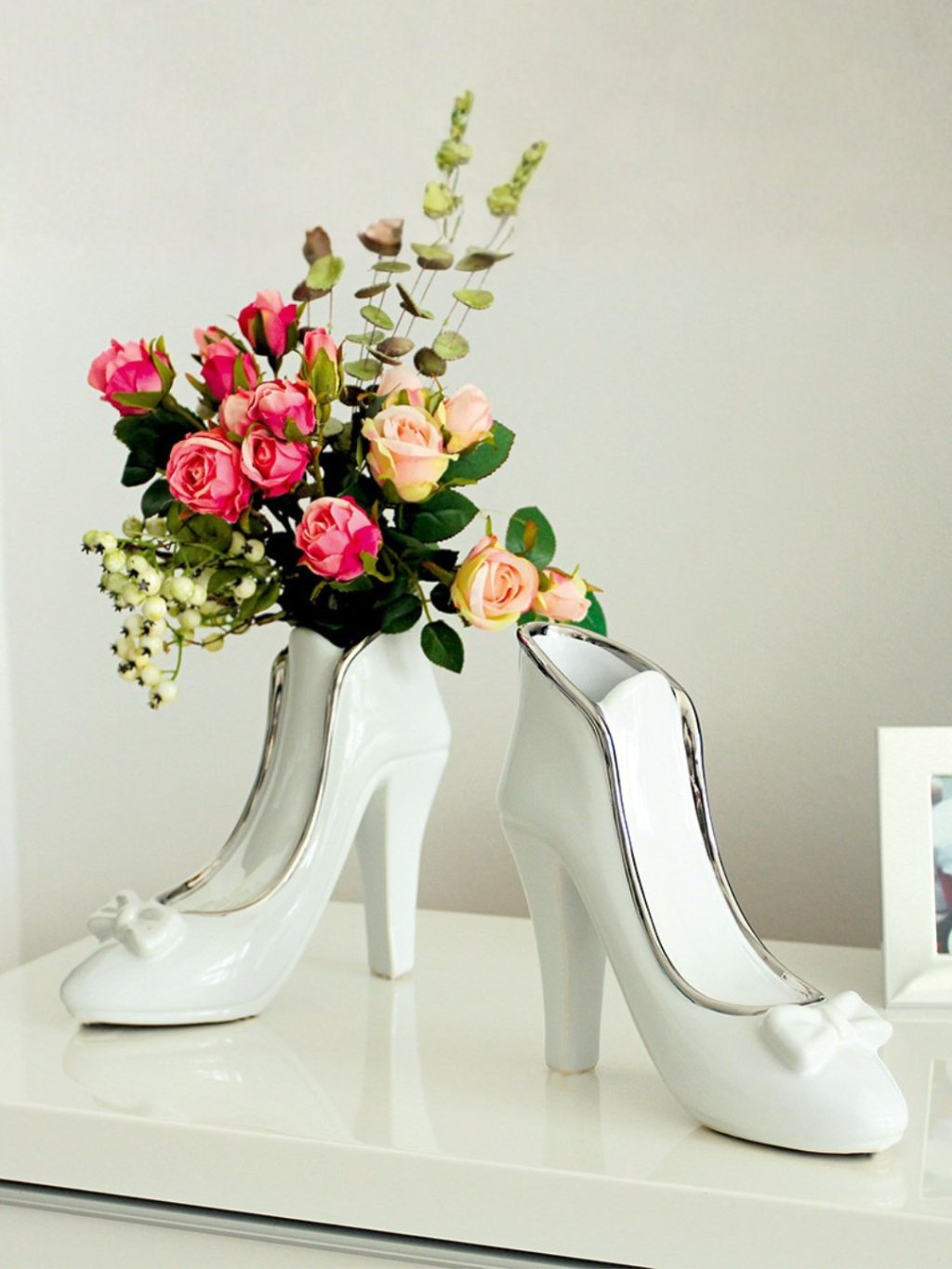Keramická váza v tvare lodičky je originálnym a hravým doplnkom pre každú milovníčku módy. S rozmermi 8 x 21,5 x 20 cm a elegantným bielym prevedením so strieborným lemovaním a mašličkou dokonale oživí toaletný stolík alebo komodu. Je ideálna na menšie kytice, ktoré v nej vytvoria neprehliadnuteľný dekoratívny prvok.