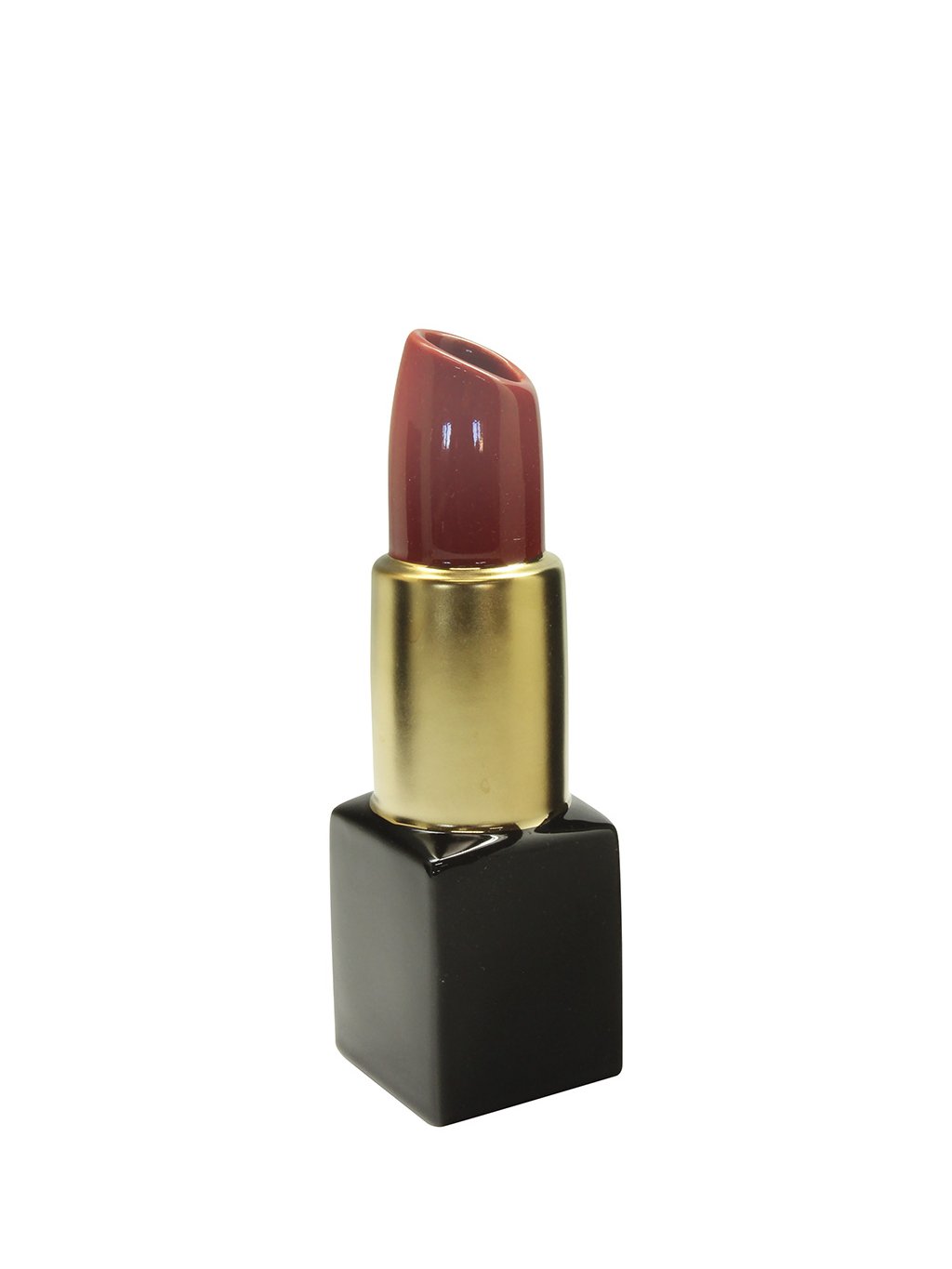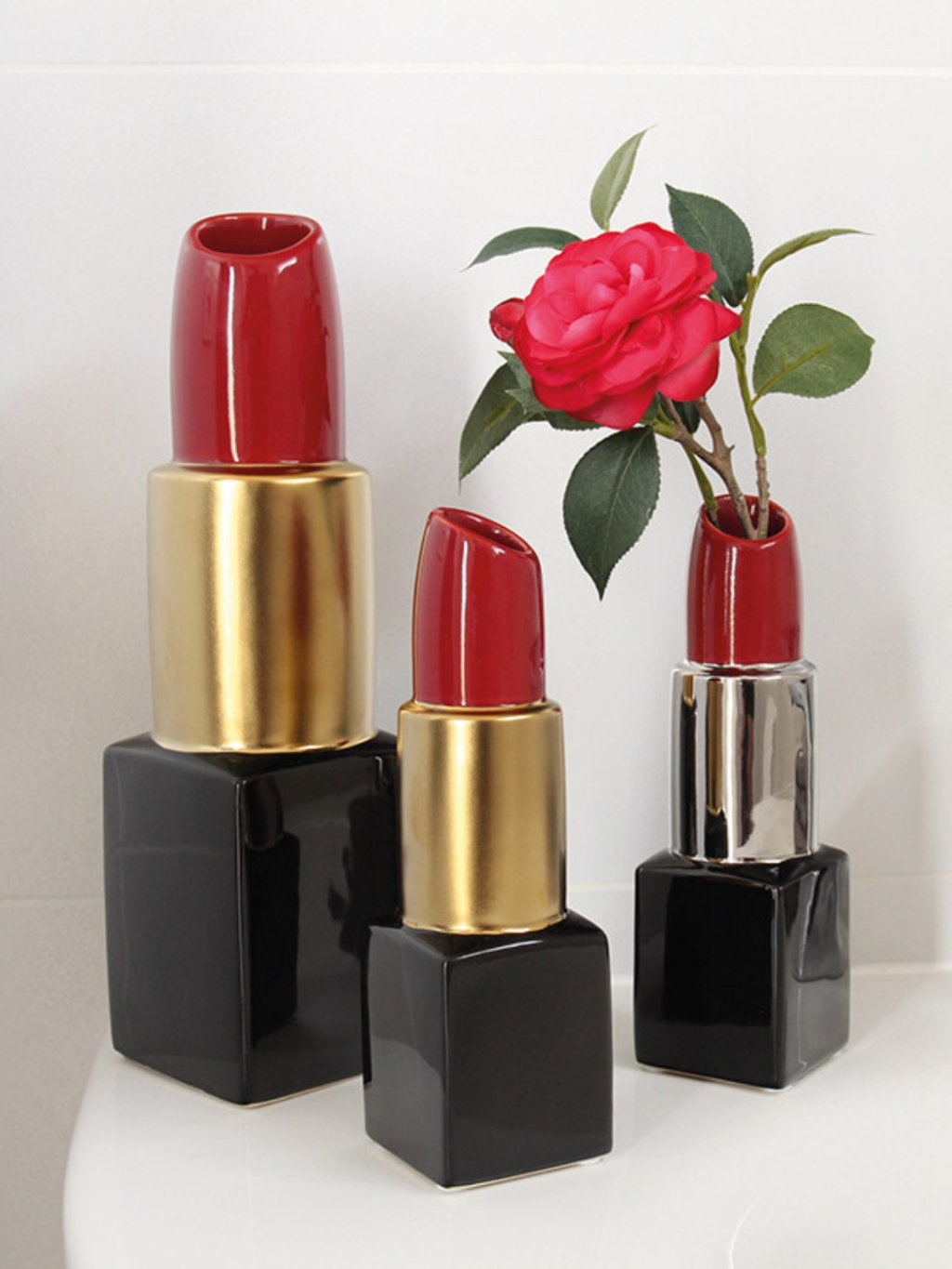 Štýlová keramická váza v originálnom tvare rúžu s elegantným zlatením. Vďaka kompaktným rozmerom 8x8 x30,5 cm je ideálnym dizajnovým doplnkom na toaletný stolík či policu. Spája v sebe hravosť a moderný štýl, čím okamžite oživí každý interiér.