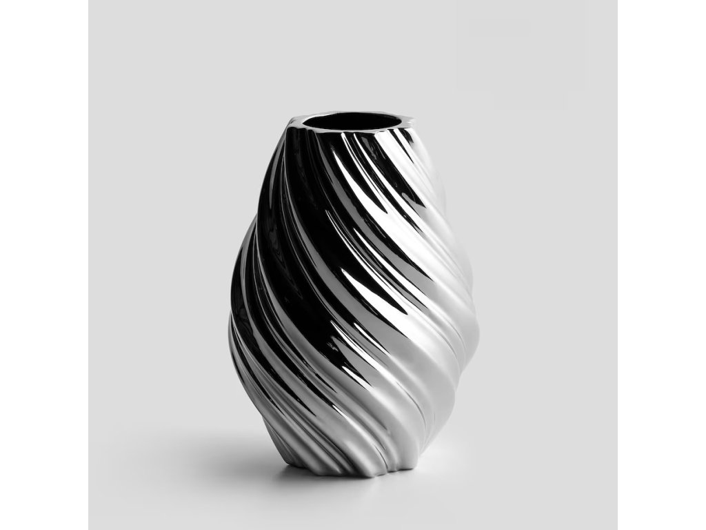 Štýlová keramická váza v striebornej farbe. Jej elegantný vzhľad a lesklý povrch z nej robia ideálny dekoratívny prvok, ktorý do interiéru vnesie moderný a luxusný prvok. Je vynikajúca na kvety alebo ako ozdoba na stolíky a poličky.