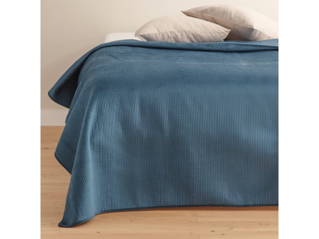 Modrá farba prehozu vnáša do interiéru sviežosť a pokoj, vytvárajúc relaxačnú atmosféru priaznivú pre odpočinok. Takýto odtieň sa dokonale kombinuje s neutrálnymi aj živšími farbami, čím vytvára harmonický a štýlový priestor. Prehoz nielenže skrášľuje posteľ, ale tiež chráni posteľnú bielizeň pred prachom a znečistením, čo prispieva k udržaniu čistoty v spálni. Je to vynikajúca voľba pre osoby, ktoré hľadajú elegantný a praktický doplnok do svojej spálne.