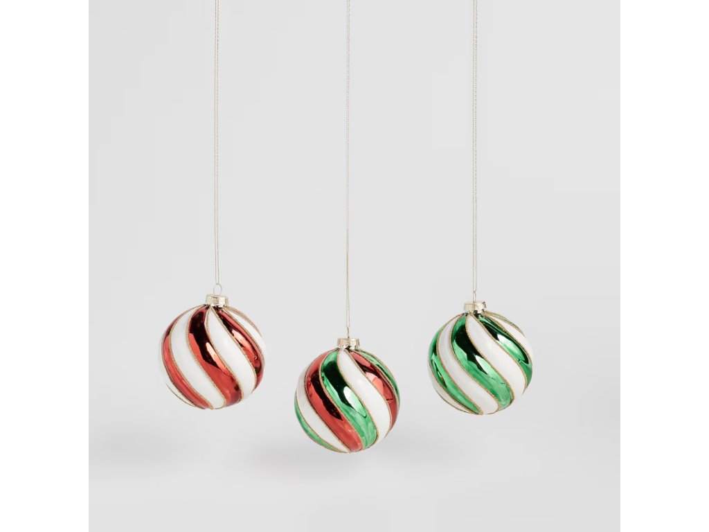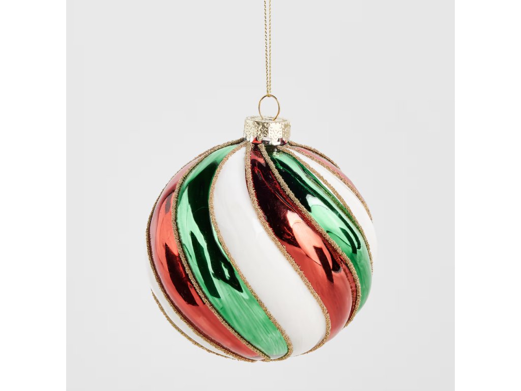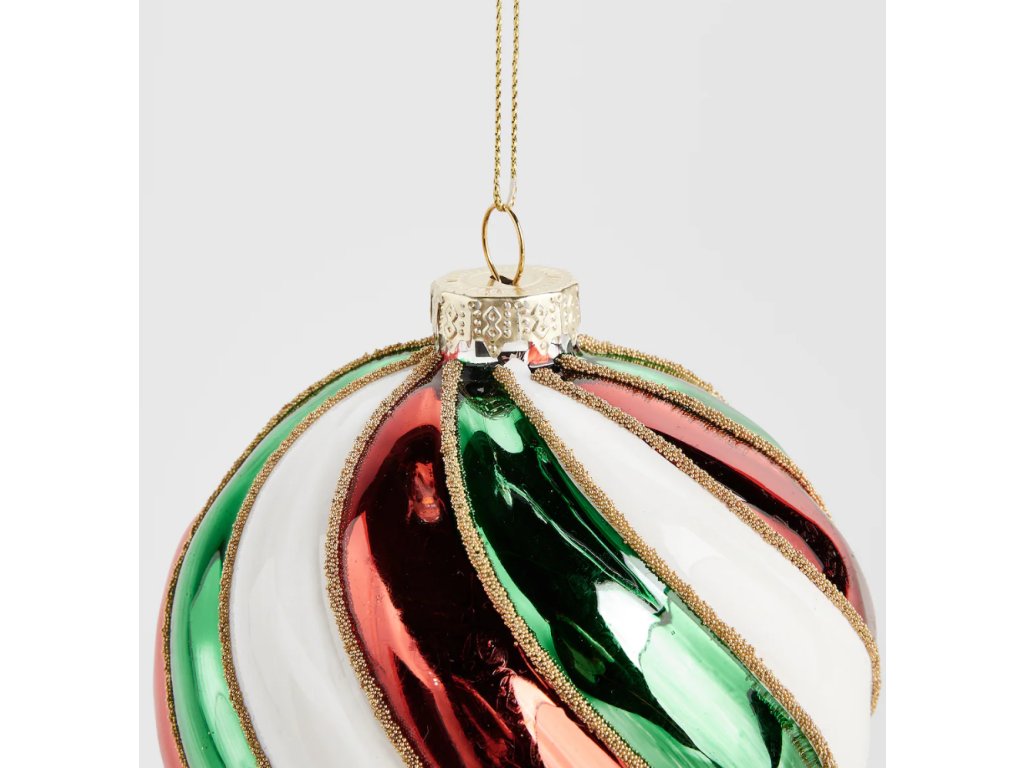 Ozdobte svoj vianočný stromček týmto hravým, no elegantným kúskom. Vianočná guľa Candyball je vyrobená z lesklého skla a inšpiruje sa tradičným motívom cukrovej palice (candycane) v klasických vianočných farbách. Guľu zdobia široké, špirálové pásy v sýtej červenej, jasnej zelenej a čistej bielej farbe, pričom farebné časti sú lemované trblietavým zlatým púdrom pre extra glamour efekt. Vďaka jej veľkosti a výraznému farebnému vyhotoveniu sa stane dominantou každého stromčeka a prinesie do vašej vianočnej dekorácie pocit radosti, farby a sladkej sviatočnej nálady.