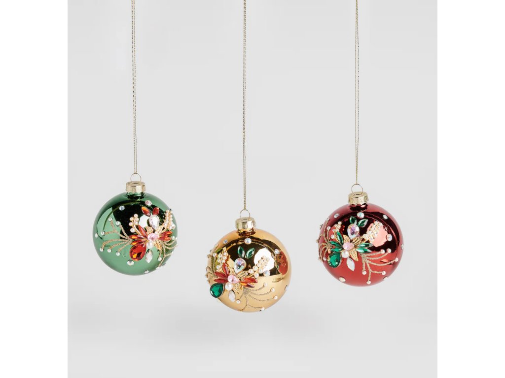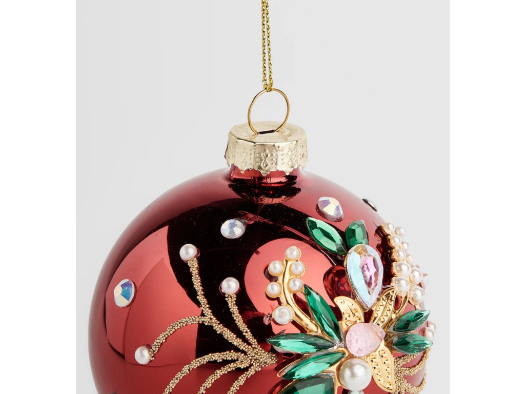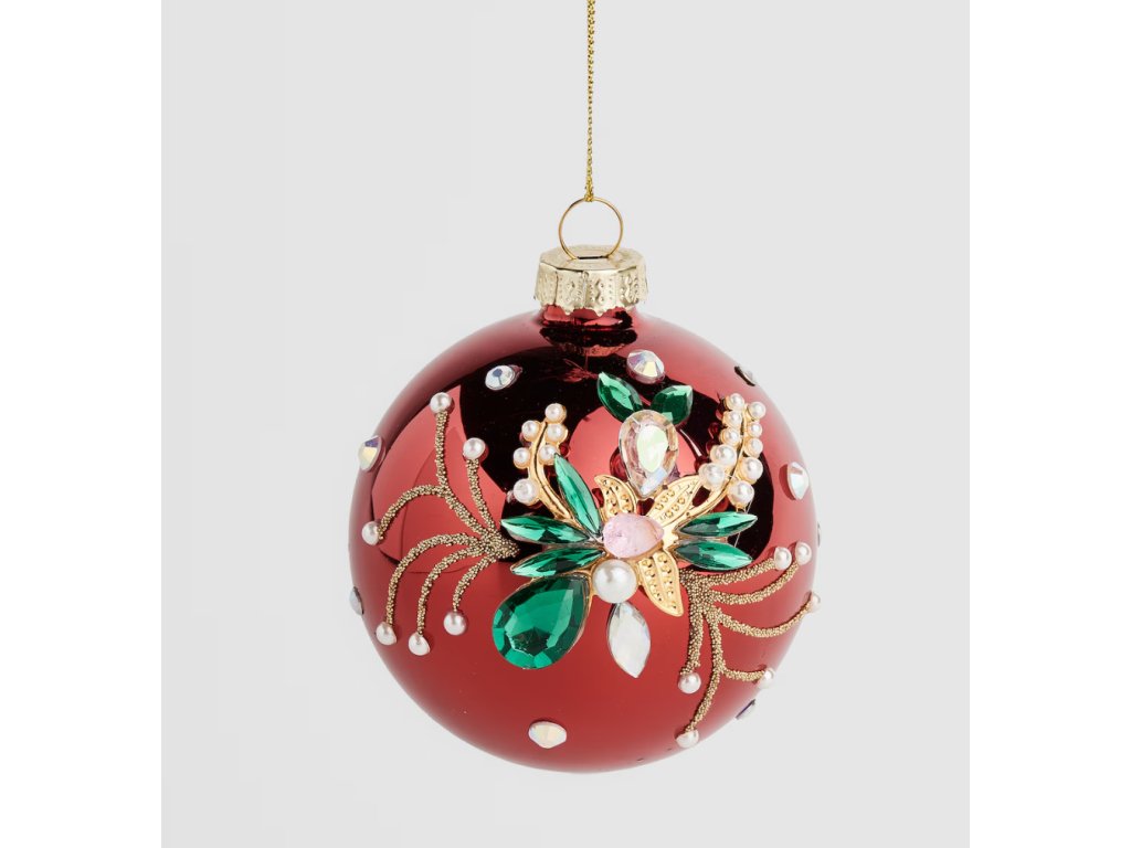 Dodajte svojmu vianočnému stromčeku luxusný a šperkovitý vzhľad s touto žiarivou červenou sklenenou guľou v štýle glamour. Ozdoba s lesklým povrchom je bohato zdobená zložitým, kvetinovým motívom v centre. Vzor je tvorený kaskádou zelených, červených, bielych a dúhových kamienkov, zlatých trblietavých liniek a bielych perál. Vďaka tomuto bohatému, ručne aplikovanému zdobeniu sa guľa stáva absolútnym stredobodom pozornosti a ideálnym doplnkom pre elegantné a slávnostné vianočné aranžmány.