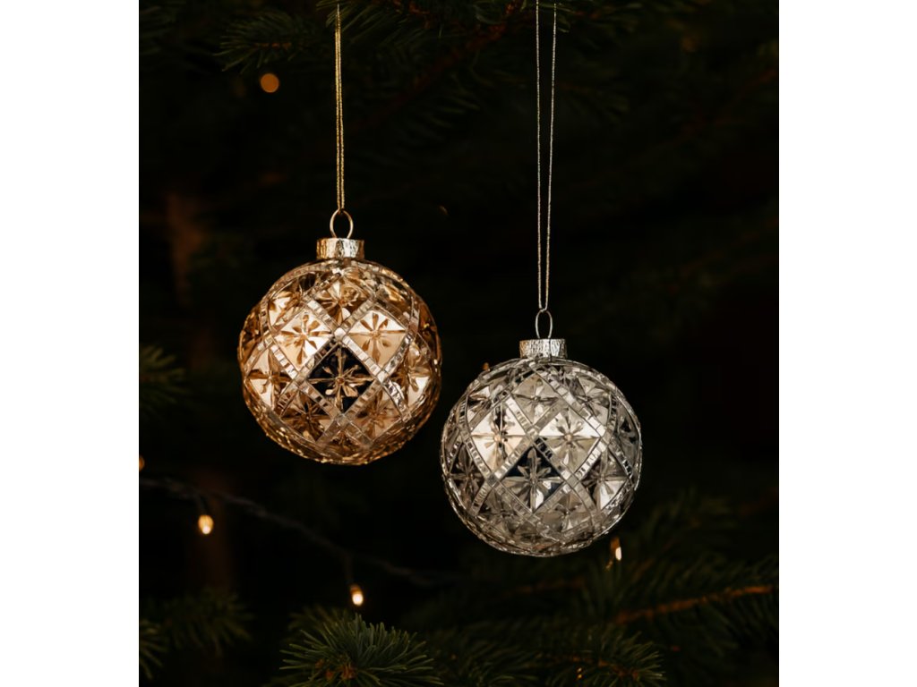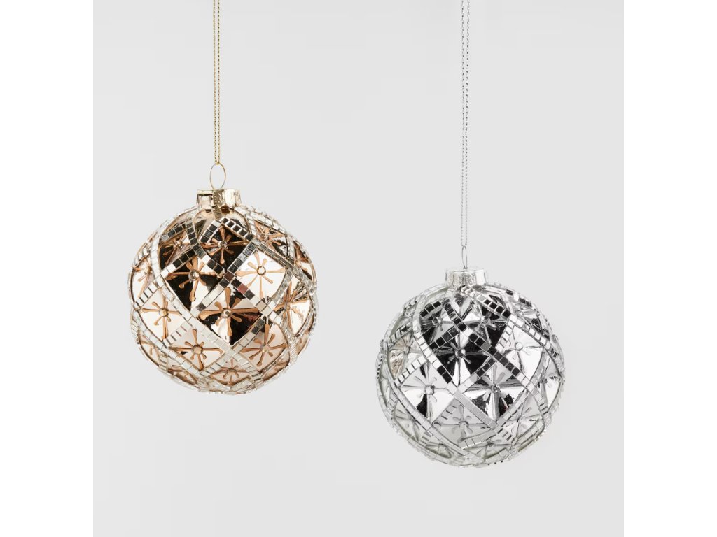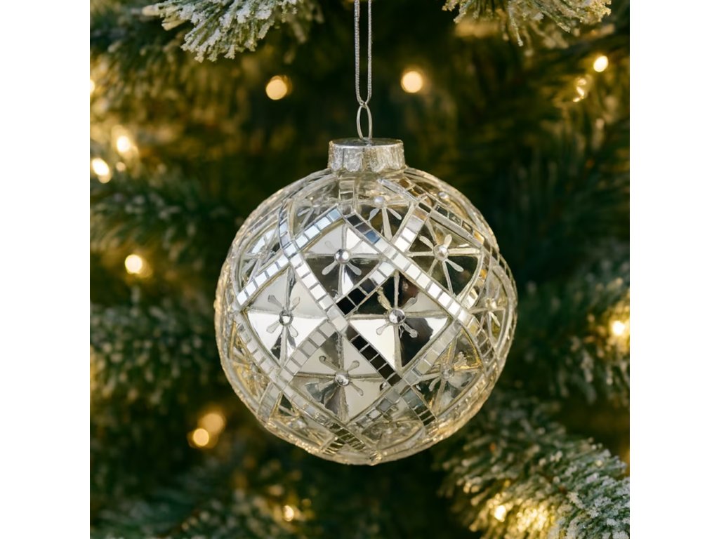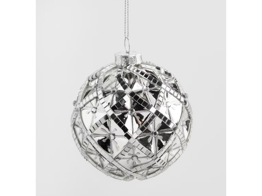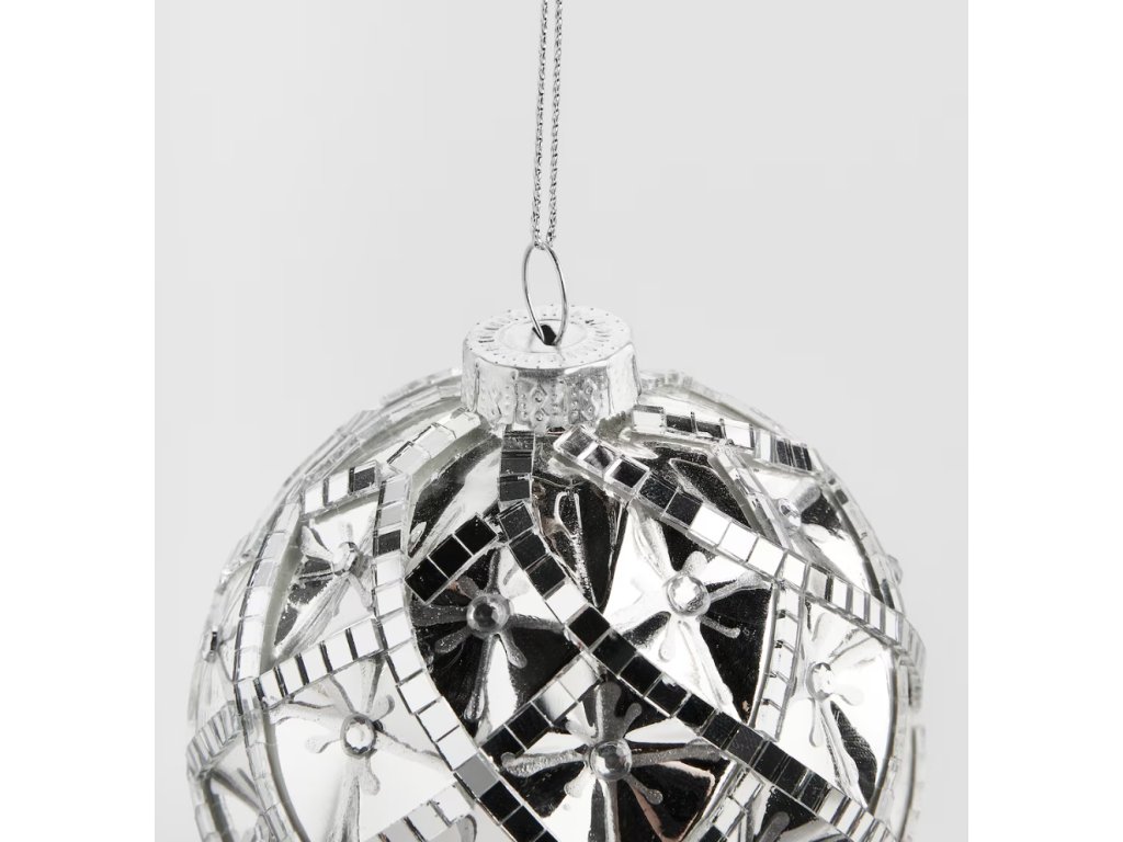 Vytvorte oslnivý efekt na svojom vianočnom stromčeku s touto unikátnou striebornou sklenenou guľou v štýle glamour. Celý povrch ozdoby s vysokým leskom je pokrytý zložitou, mozaikovou štruktúrou z malých zrkadlových a lesklých strieborných kúskov v tvare kosoštvorcov a štvorčekov. Táto mozaika pripomínajúca disko guľu alebo šperkovanú sieť sa nádherne ligoce a odráža svetlá, čím vytvára luxusný a dramatický vizuálny efekt. Je to dokonalý a moderný akcent pre sviatočné aranžmány, ktoré si zakladajú na elegancii a výraznom lesku.
