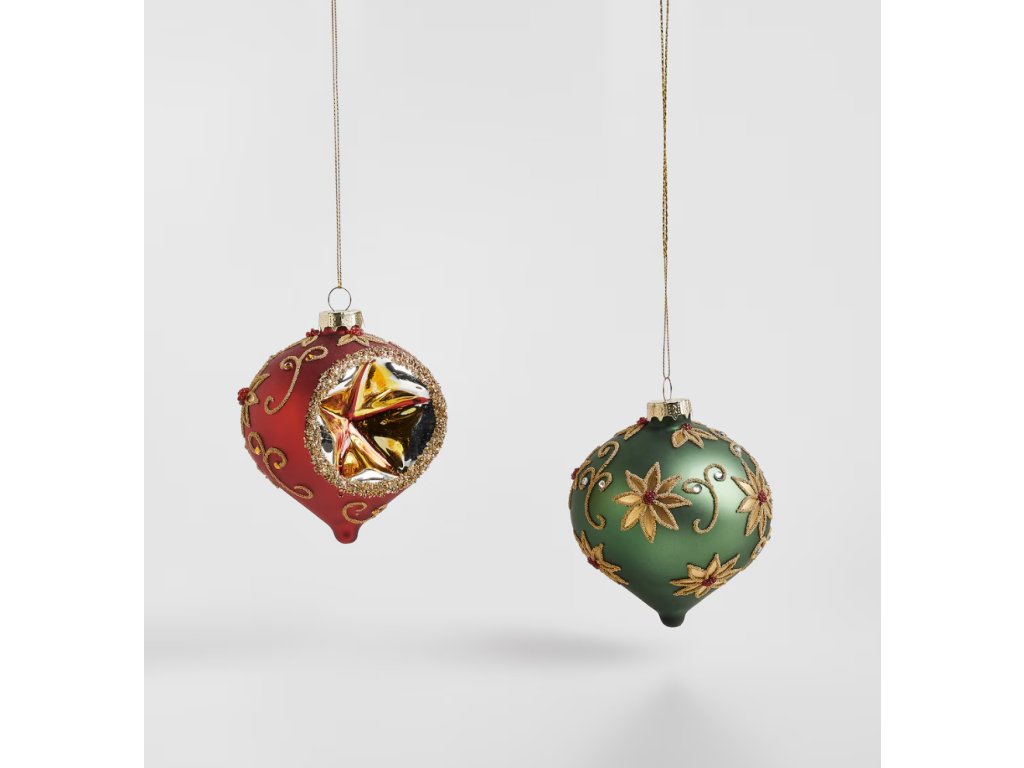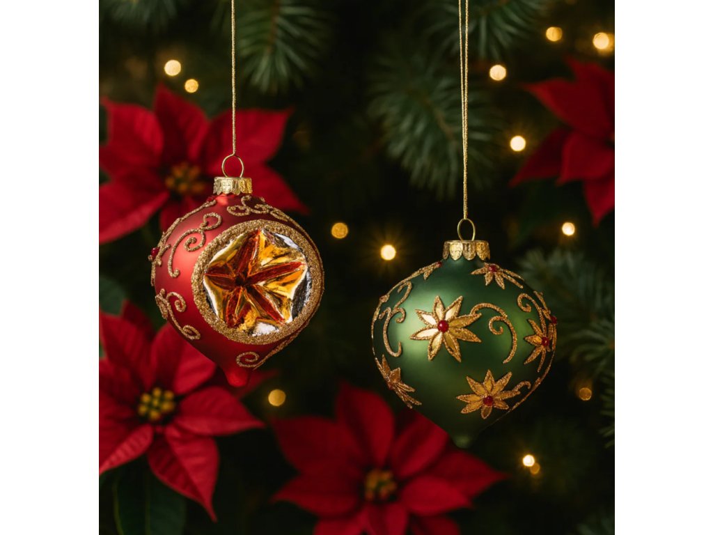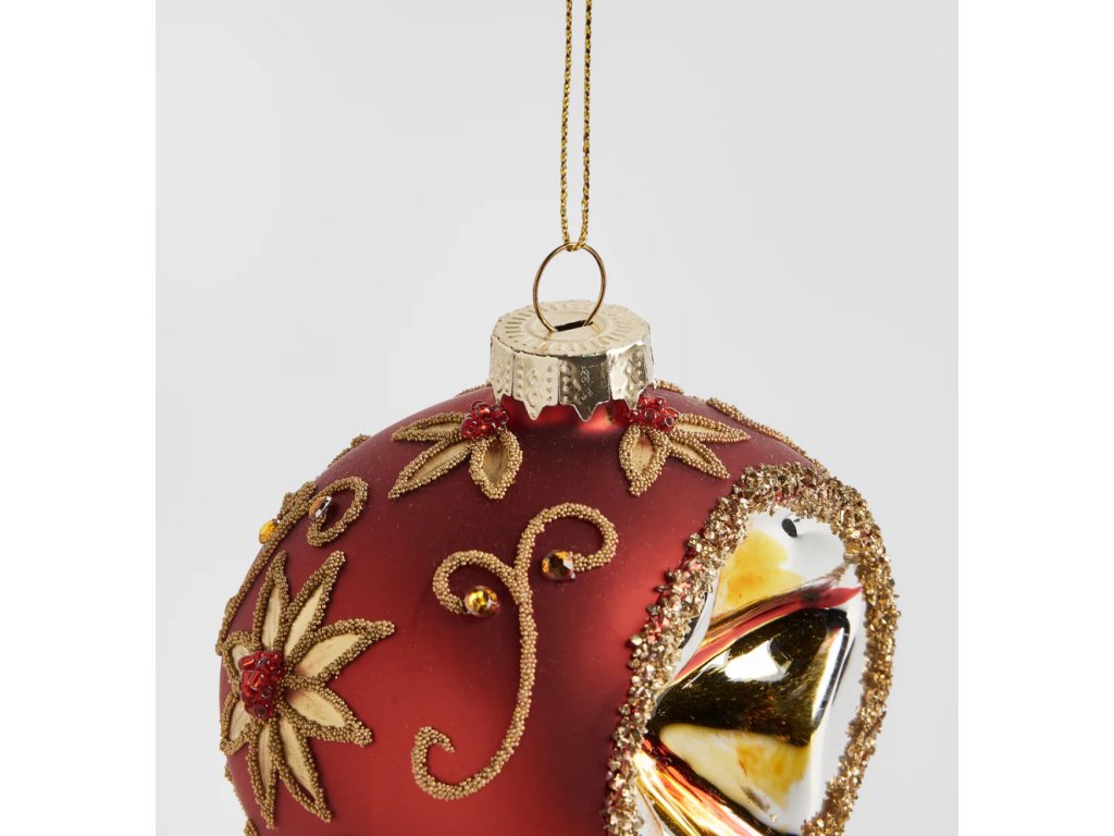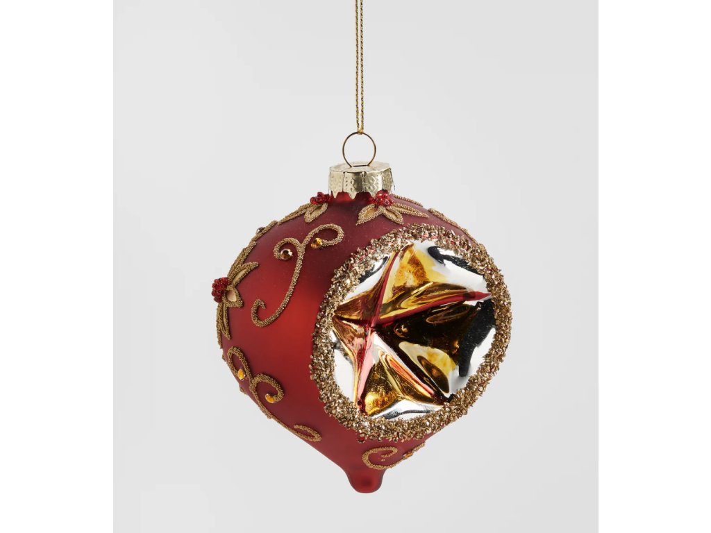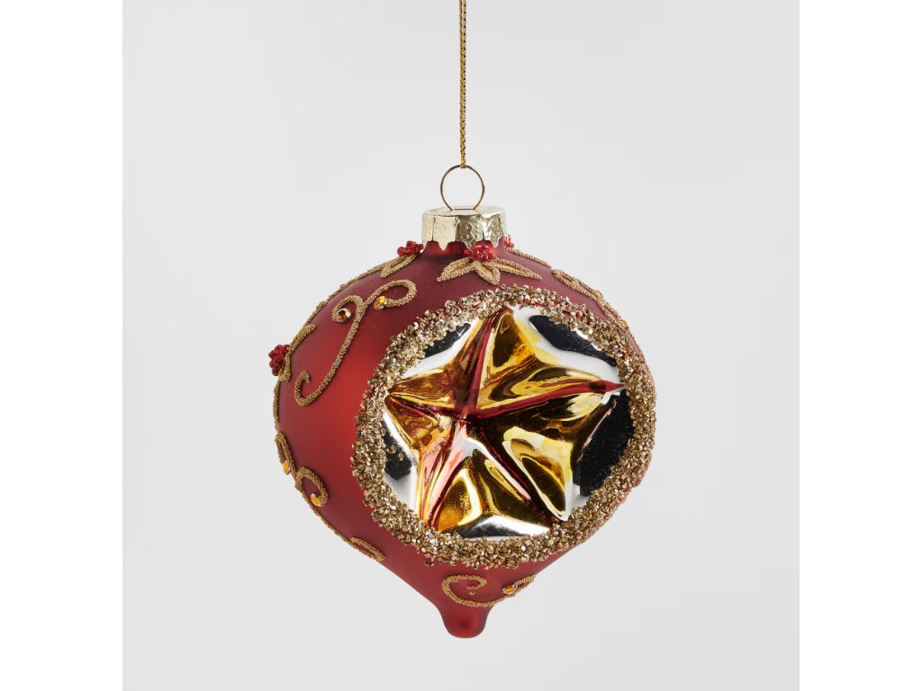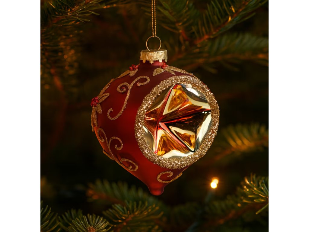 Ozdobte svoj vianočný stromček touto výnimočnou sklenenou guľou, ktorá v sebe spája tradičnú slávnosť s luxusným remeselným spracovaním Táto guľa v tvare vretena je vyrobená z červeného skla a jej povrch je matný, čo vytvára pôsobivý kontrast s lesklou dekoráciou. V strede dominuje vpustená, zrkadlovo lesklá zlatá hviezda s odrazovým efektom, orámovaná hrubým zlatým a trblietavým granulátom. Celú guľu zdobia plastické, zlaté ornamenty a červené koráliky. Vďaka ručne zdobenému prevedeniu vnesie táto ozdoba (výška ) do vášho interiéru hĺbku, teplo a nádych kráľovskej elegancie.