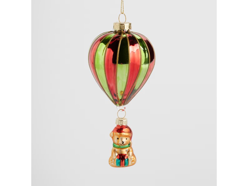 Šťastnú cestu za darčekmi! Táto sklenená ozdoba v tvare balóna je plná sviatočnej nálady. Pestrofarebný balón v tradičnej červenej a zelenej farbe nesie pod sebou roztomilého plyšáka v čiapke s malým darčekom. Je to magický kúsok, ktorý vnesie do vášho vianočného stromčeka radosť, hravosť a pocit, že kúzlo Vianoc je na ceste!