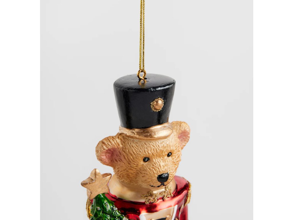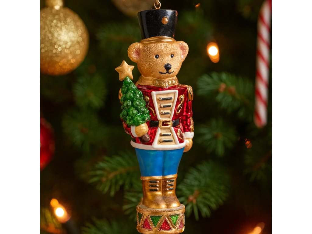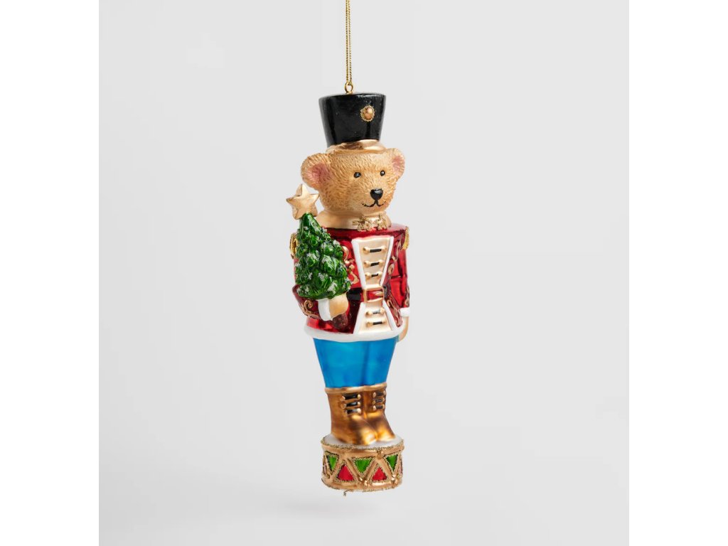 Slávnostný strážca Vianoc! Predstavujeme vám jedinečnú závesnú ozdobu, v ktorej sa maskot mení na Luskáčika. Tento macko v slávnostnej červeno-modrej uniforme drží v labke malý vianočný stromček s hviezdou. Vďaka bohatému zdobeniu a lesklým farbám vnesie táto figúrka do vášho stromčeka tradičnú eleganciu, teplo a kúzlo rozprávkových Vianoc.