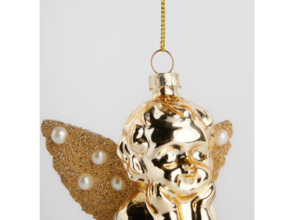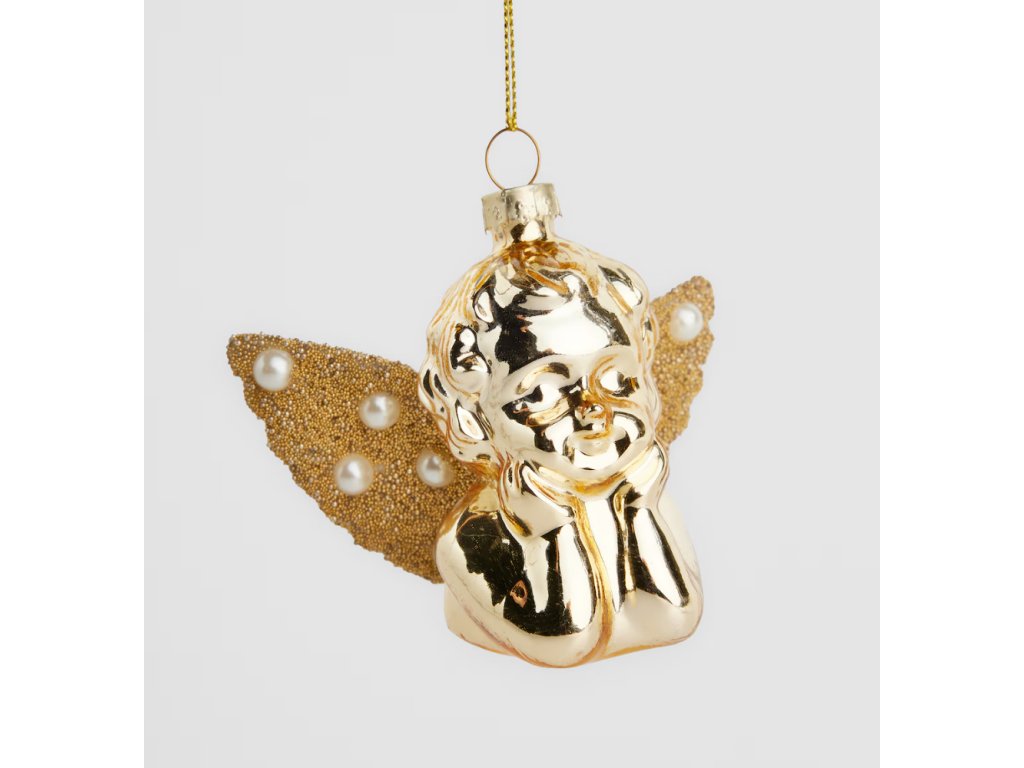 Prineste na váš vianočný stromček nádych nebeskej elegancie s touto zlatou sklenenou ozdobou v tvare anjelika. Tradičná vianočná dekorácia je majstrovsky spracovaná so žiarivým zlatým povrchom a jemnými krídelkami, ktoré zdobia trblietavé detaily a perly. Tento anjelik sa stane stredobodom pozornosti a dodá vášmu interiéru hrejivú a slávnostnú atmosféru. Je to ideálny kúsok pre tých, ktorí oceňujú klasický a vkusný vianočný štýl. Vymeňte si ho s radosťou na svoj stromček alebo ho darujte ako hodnotný vianočný dar.