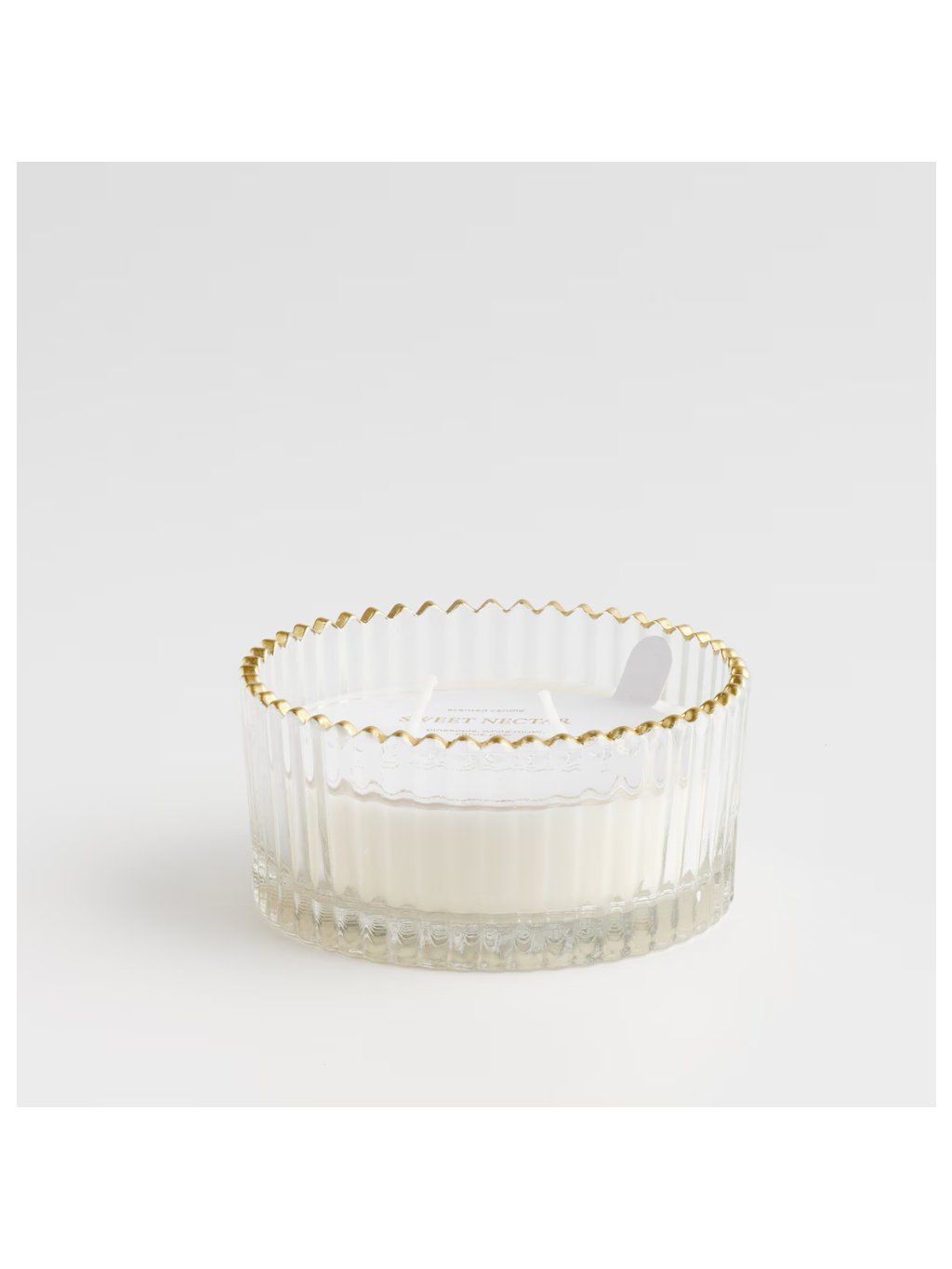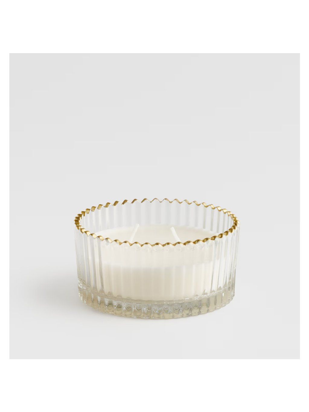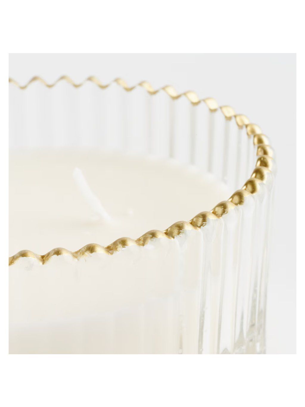 Biely vosk kontrastuje s priehľadným sklom a ozdobným zlatým okrajom, čím dokonale zapadá do vycibreného glamour štýlu. Jemne zvlnený okraj nádoby a vertikálne drážkovanie spôsobujú, že sviečka priťahuje pozornosť aj bez zapálenia. Hodí sa do klasických aj moderných interiérov a odporúča sa aj ako vkusný darček na každú príležitosť.