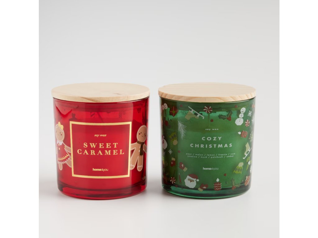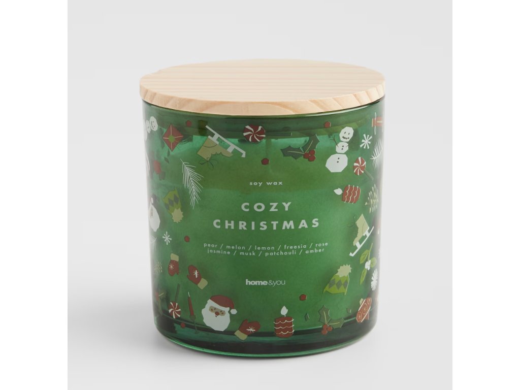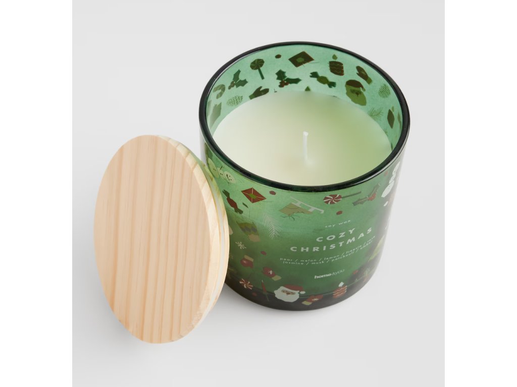 Táto tmavozelená vonná sviečka je ideálnym spôsobom, ako vytvoriť útulnú vianočnú atmosféru a zároveň dekorovať váš domov. Sviečka s priemerom 10 cm a výškou 10 cm je umiestnená v sklenenom pohári, ktorý je bohato zdobený vianočnými motívmi a nápisom "COZY CHRISTMAS". Vďaka zmesi sójového vosku a parafínu horí sviečka až 30 hodín a šíri sviatočnú kvetinovú vôňu s tónmi hrušky, melónu, citrónu, frézie, ruže, jazmínu, pižma, pačuli a jantáru.